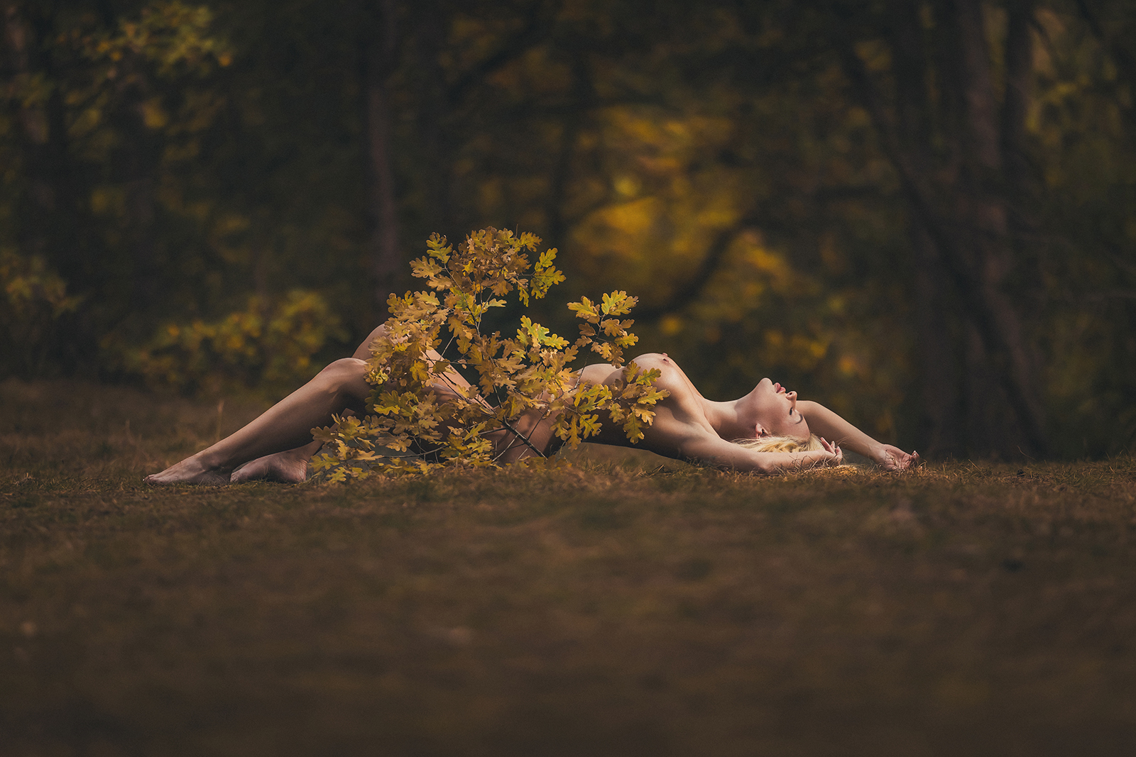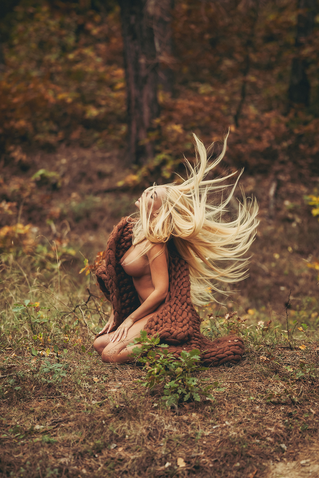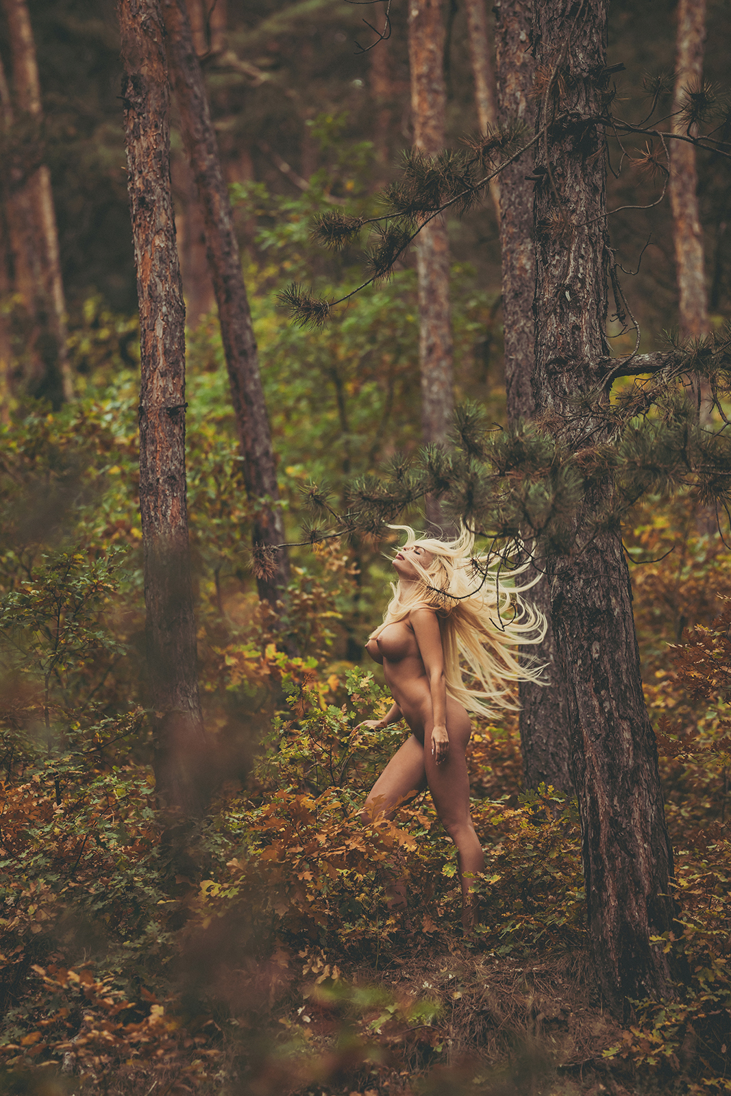 Весьма привлекательная блондинка, немного доработанная специалистами, охотно позирует в лесу