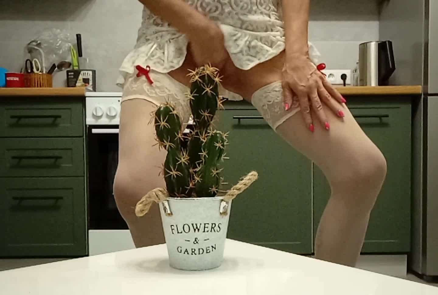 В новом сексуальном белье садится своей пиздой на колючий кактус, чтобы мастурбировать на нём.
