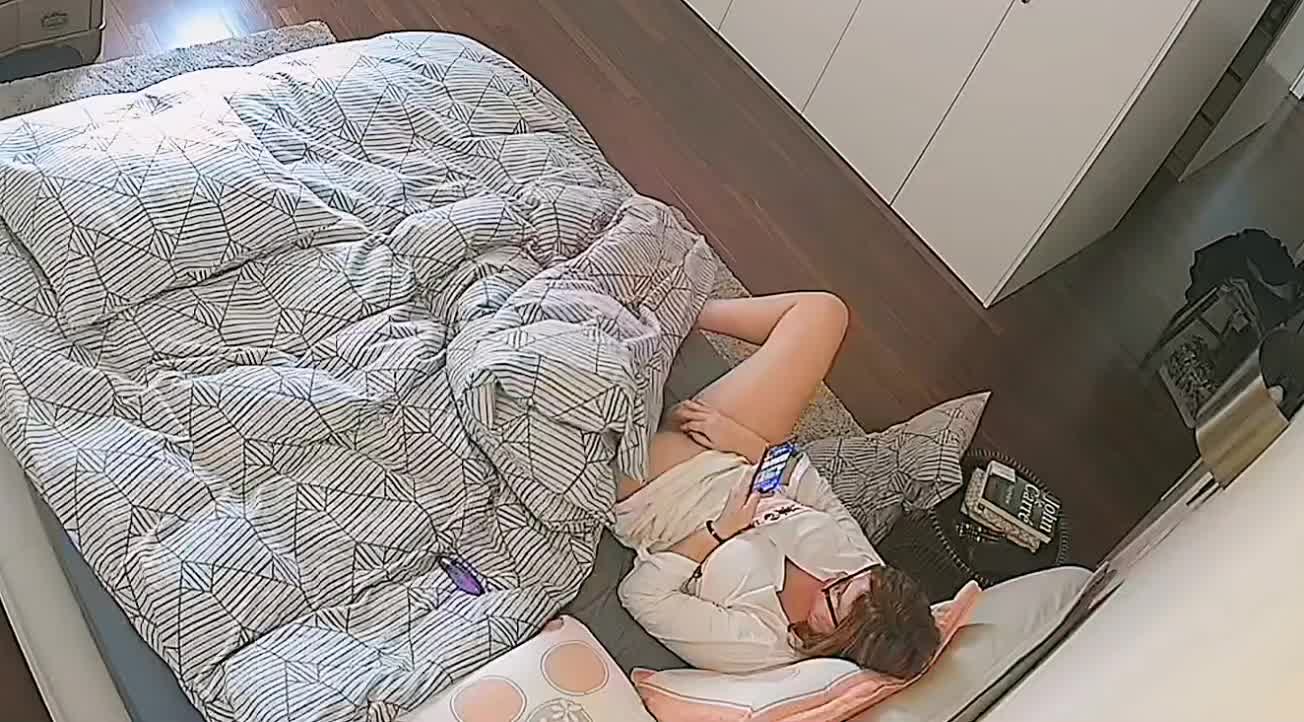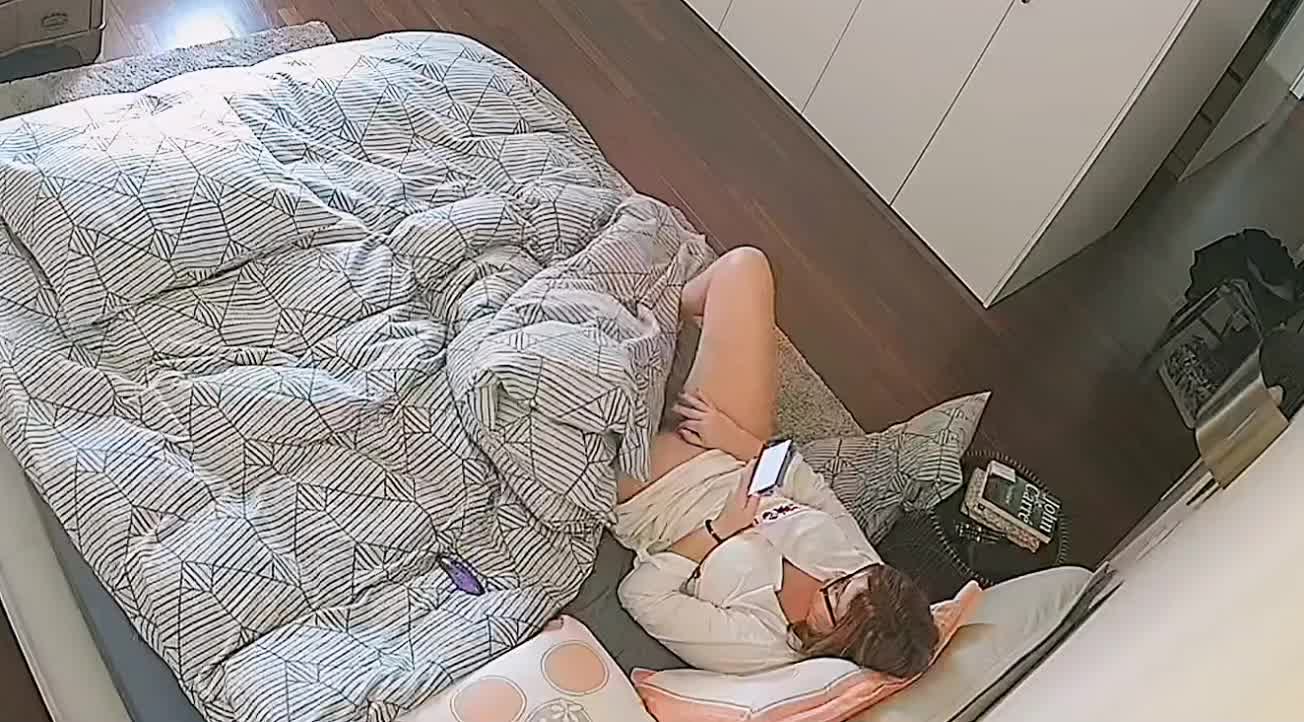 Дамочка смотрит на телефоне порнушку и теребонькает пальчиком свой клиторок.
