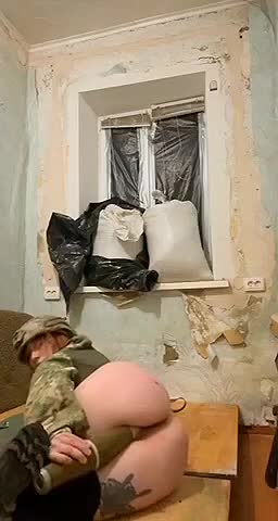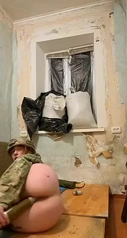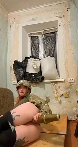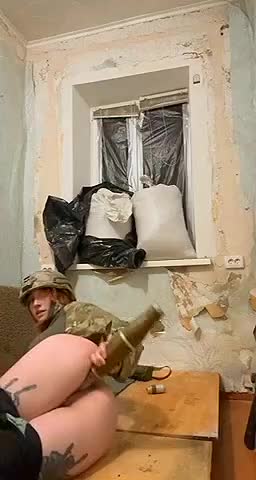 Девка в камуфле, берцах и каске вставляет себе в песду головную част гранотометного выстрела!