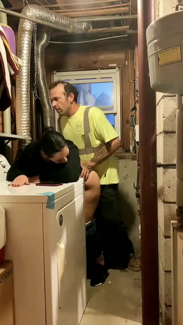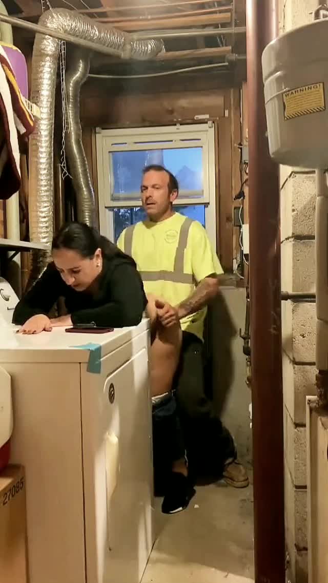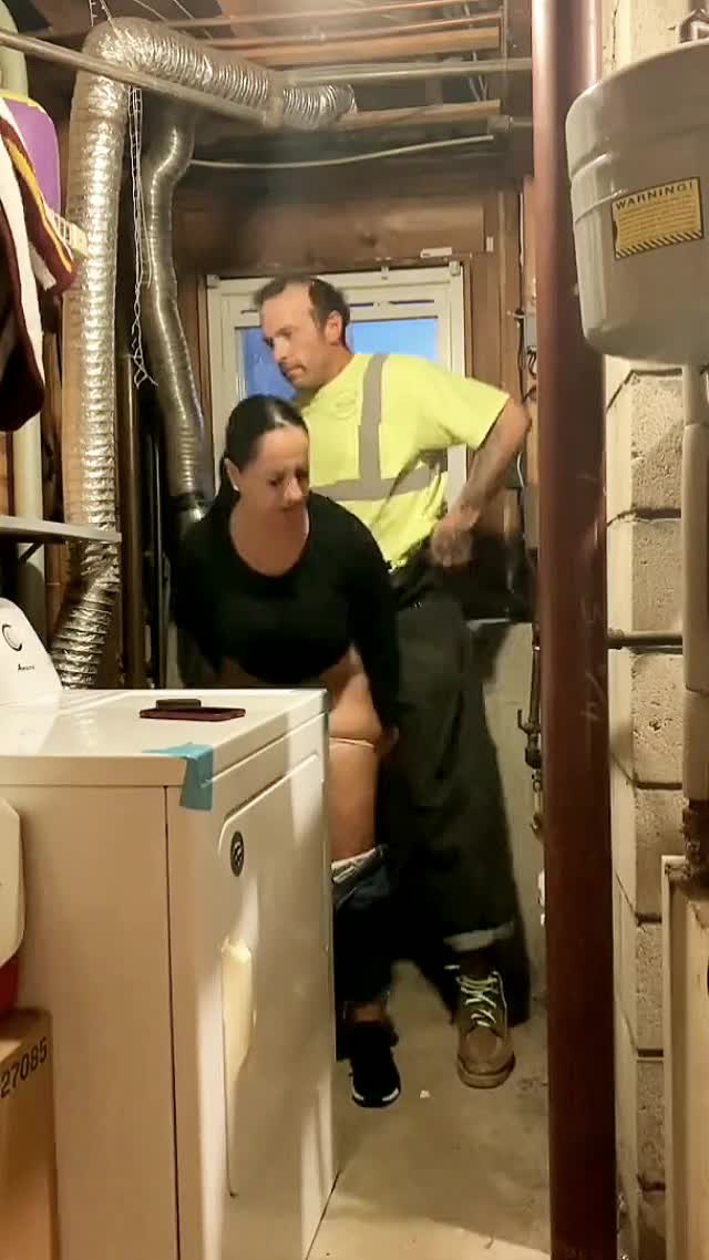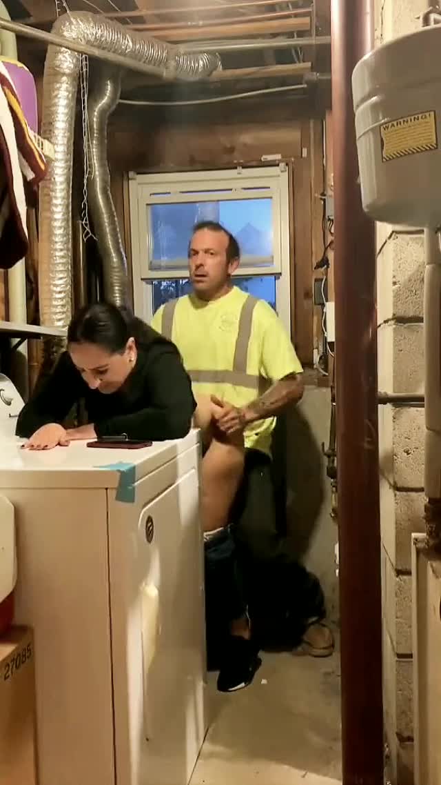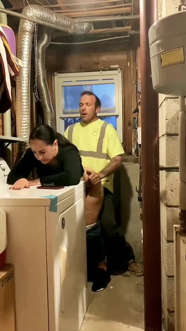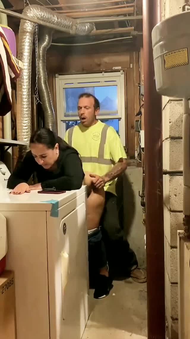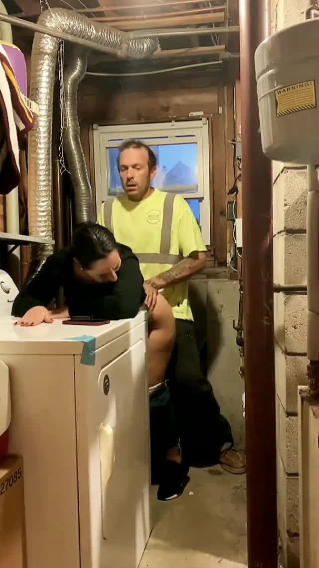 Мужик ремонтник засаживает хозяйке в какой-то подсобке.