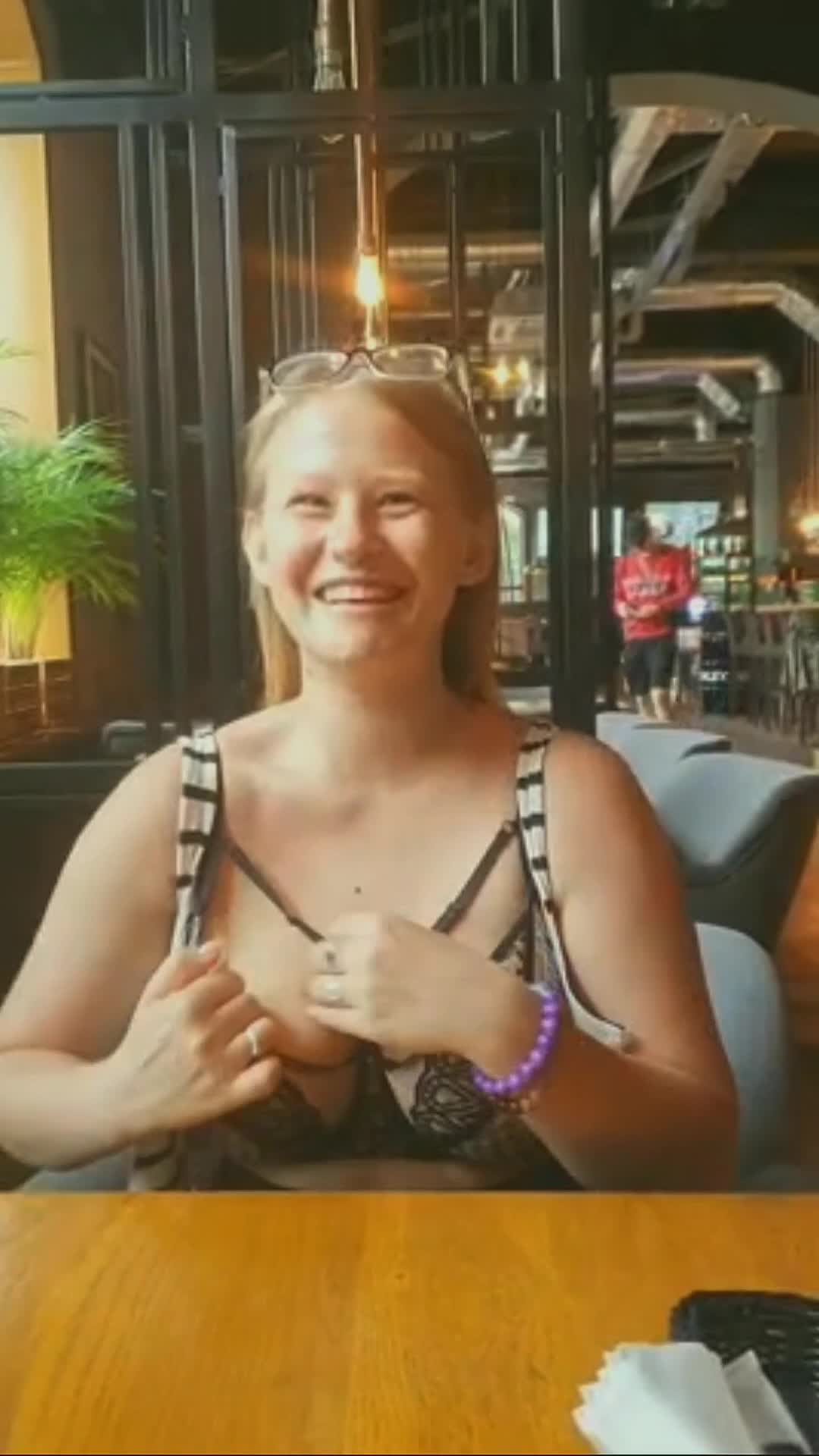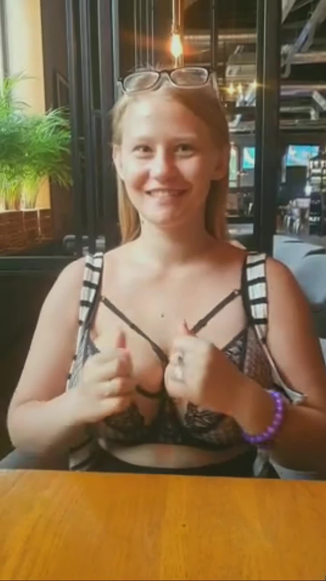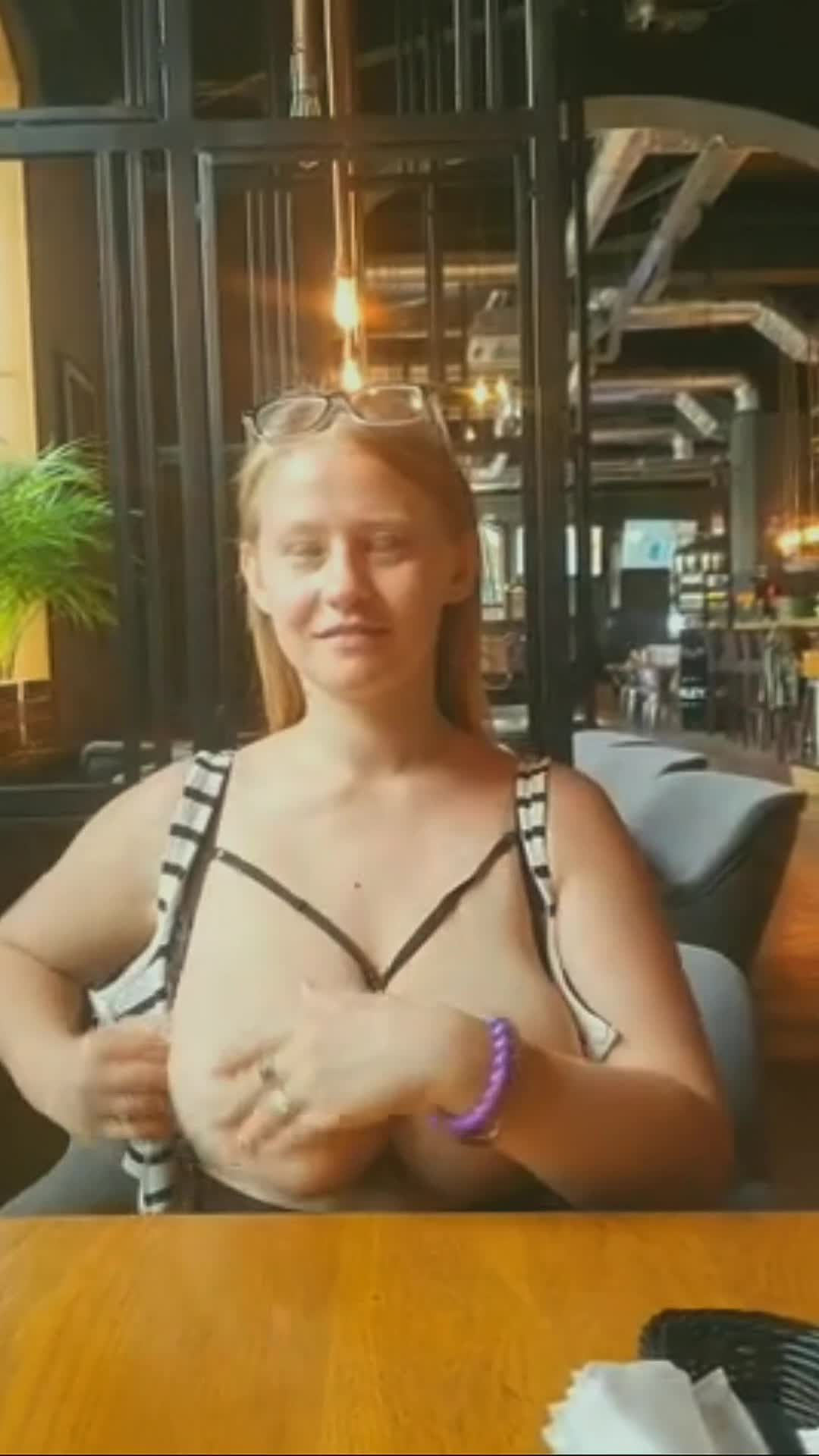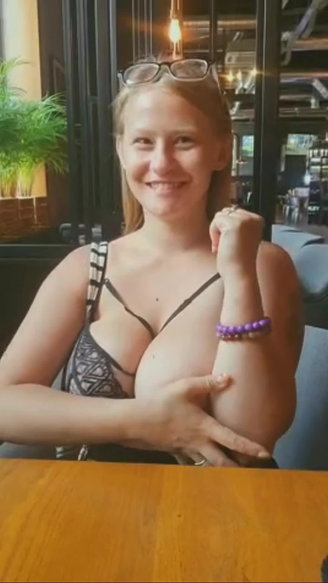 Девка показывает свои внушительные сиськи в кафешке.
