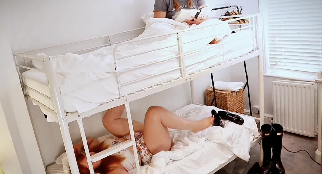 Две подруги-пухляшки подрюкивают каждая сама себе дилдаками сидя на двухярусной кровати.