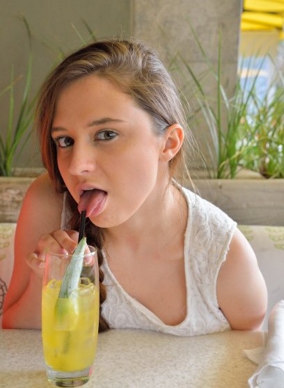 Девушка "подмигивает" своей писькой фотографу в кафе и на эскалаторе.