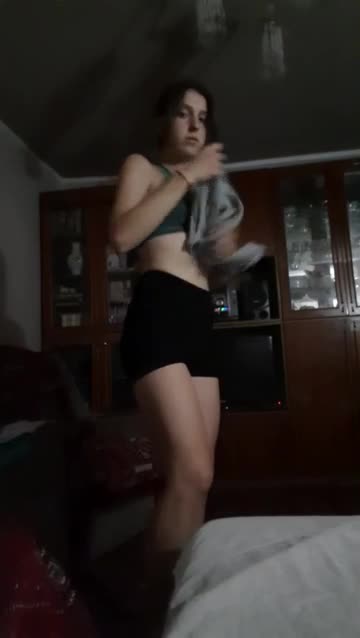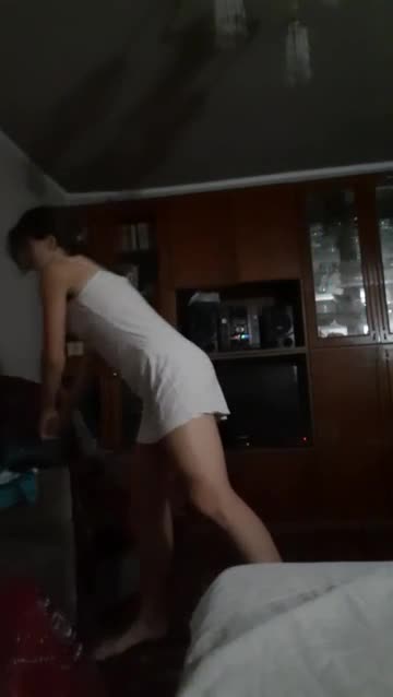 молоденькая девушка переодевается в ночнушку снимая себя на телефон