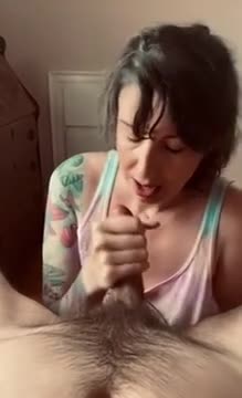 Зрелая привлекательная женщина с татуировкой на руке сосет член, пока он не выстреливает спермой