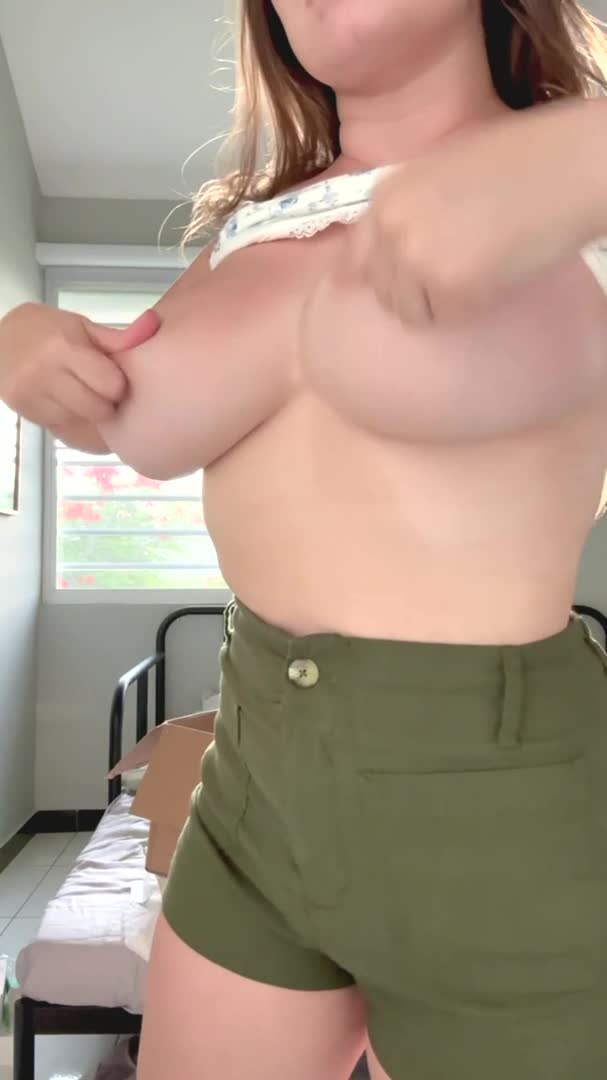 Симпатичная девушка показывает шикарную фигуру и большие отличные сиськи.