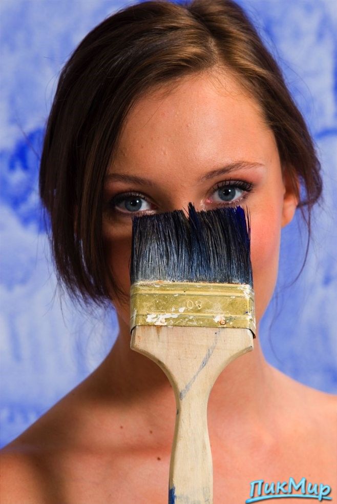 красивая и веселая эротическая фотосессия обнаженной девушки с большой грудью и бритой киской, которая рисует на стене смайлик, излучающий позитив.