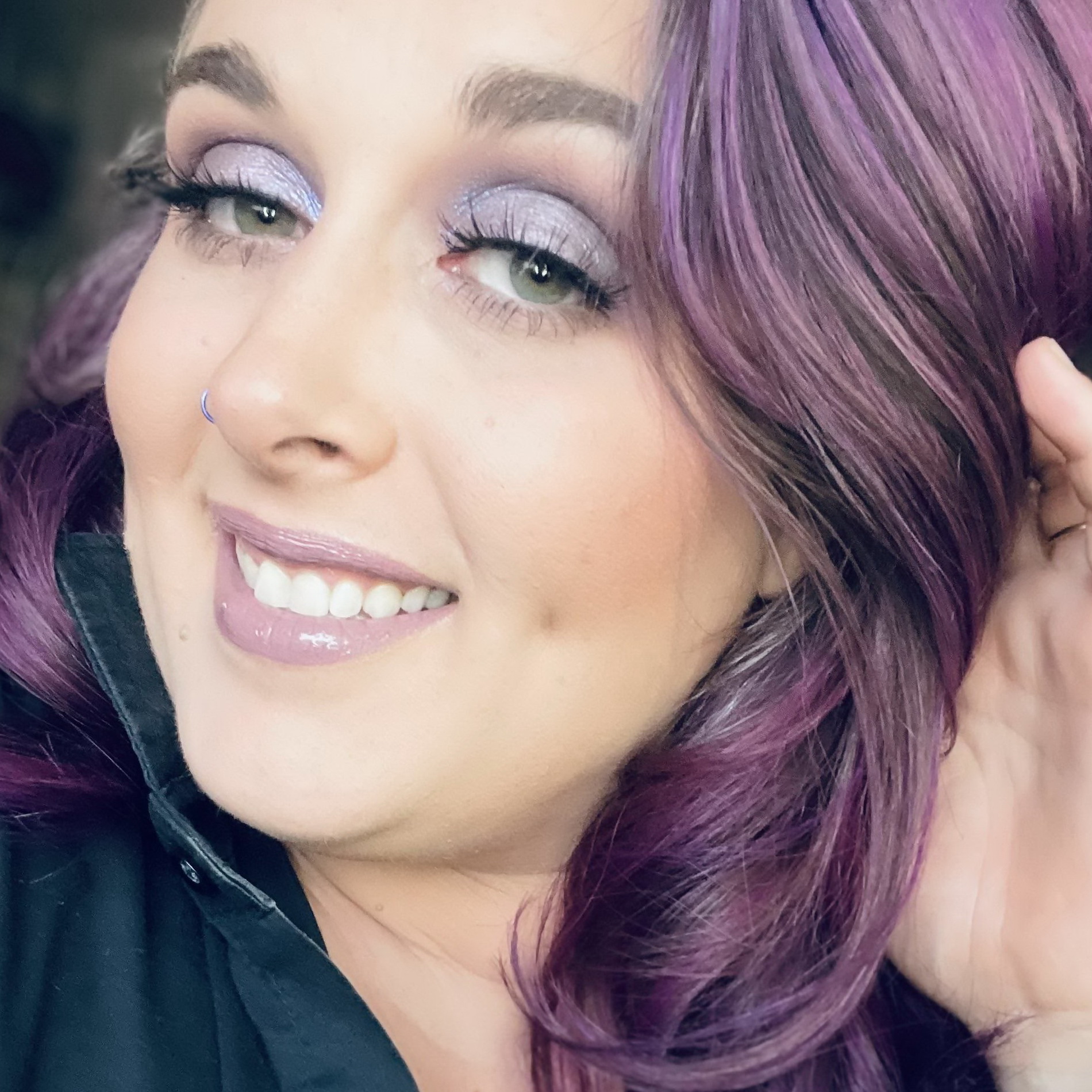 Красивая женщина с фиолетовыми волосами показывает своё привлекательное тело.