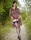 Брюнетка в роще показывает себя на красивых фото.