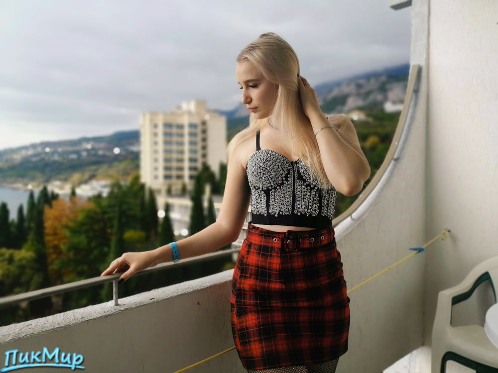 Молоденькая блондинка позирует на фоне крымской природы и в отеле