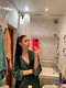 стройная девушка без сисек позирует в зелёном халатике и без него