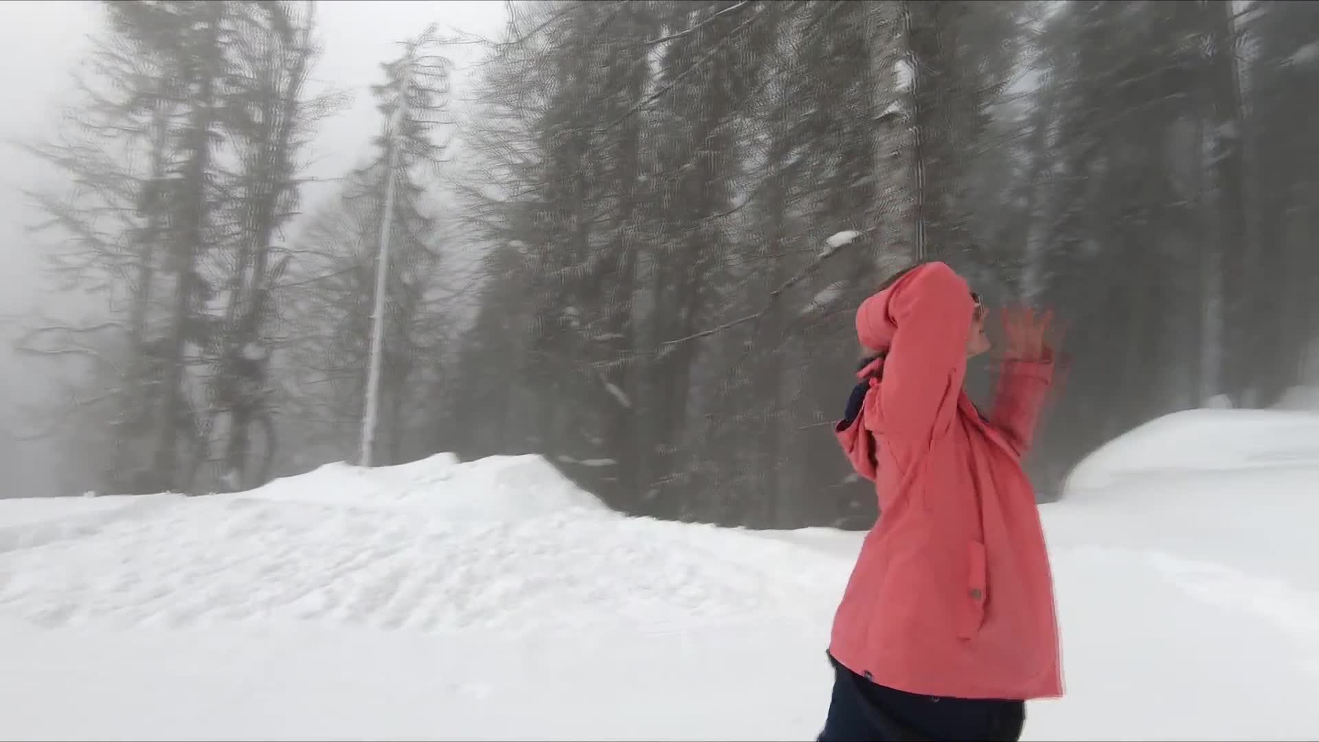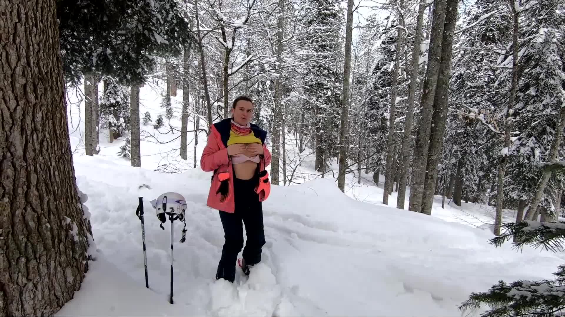 симпатичная женщина обнажается прогуливаясь на природе зимой в горах