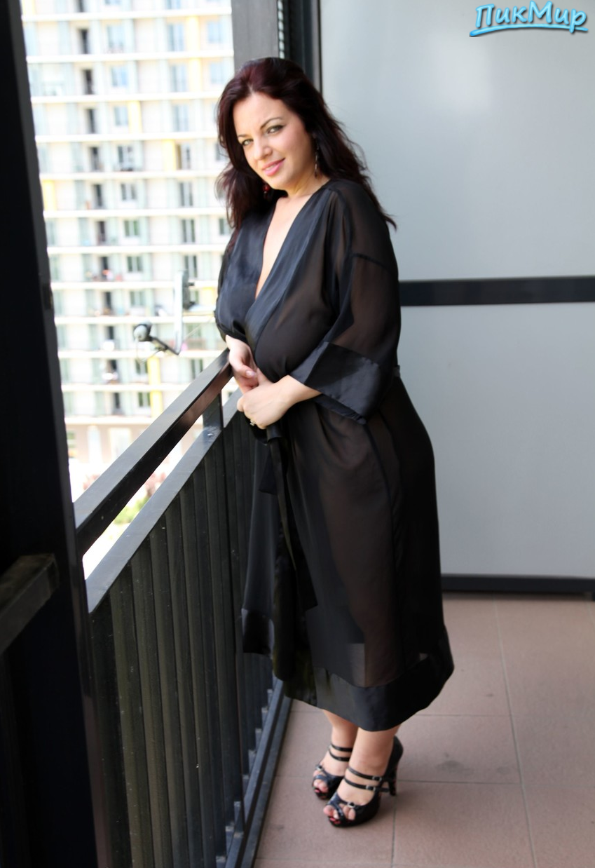 Кошечка вышла на балкон похвастать приятным мягким телом , черный халатик контрастирует с ее молочной кожей