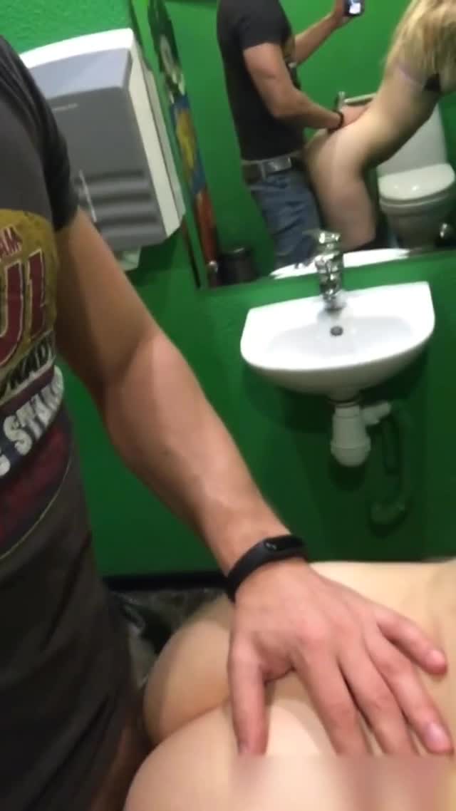 Рачком имеет блондиночку в туалете и снимает на телефон через зеркало.