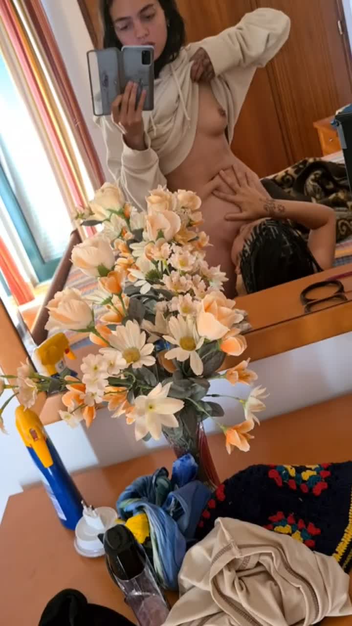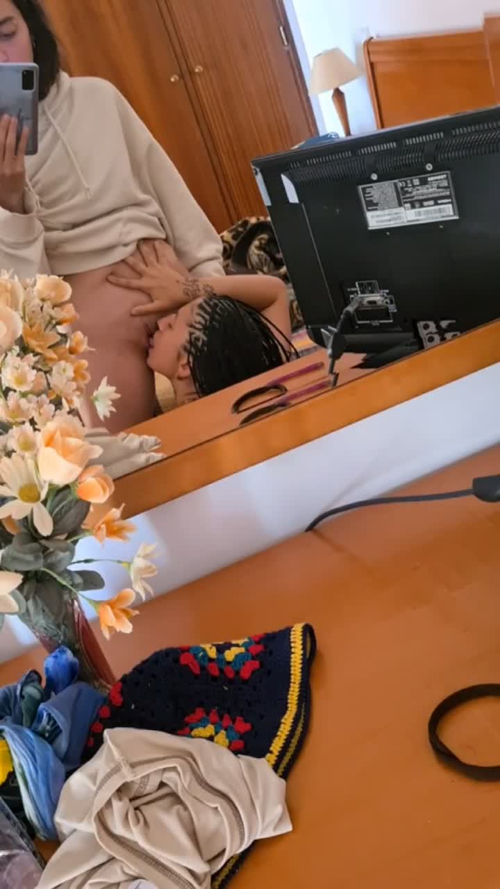 Две бисексуалочки на отдыхе. Одна делает куни другой в номере отеля у зеркала.