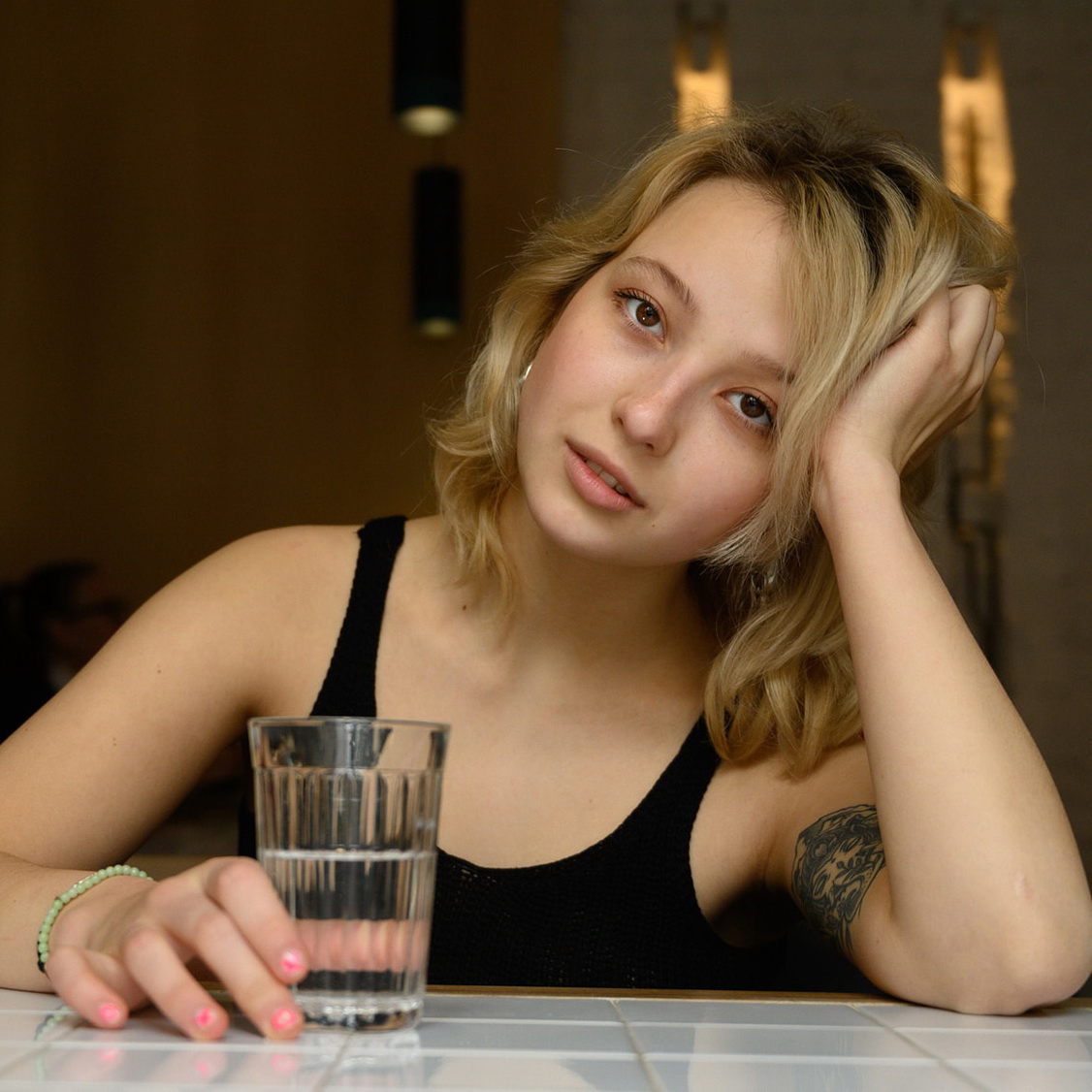 Гранёный стакан на столе на первом кадре.Так и напоминает песню рюмка водки на столе. А девица неплохая.