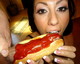 Красотка делает минет, засунув член в горячий хотдог с кетчупом.