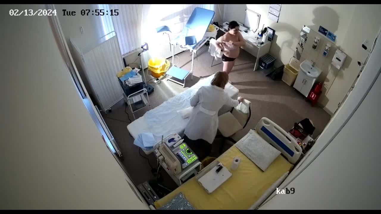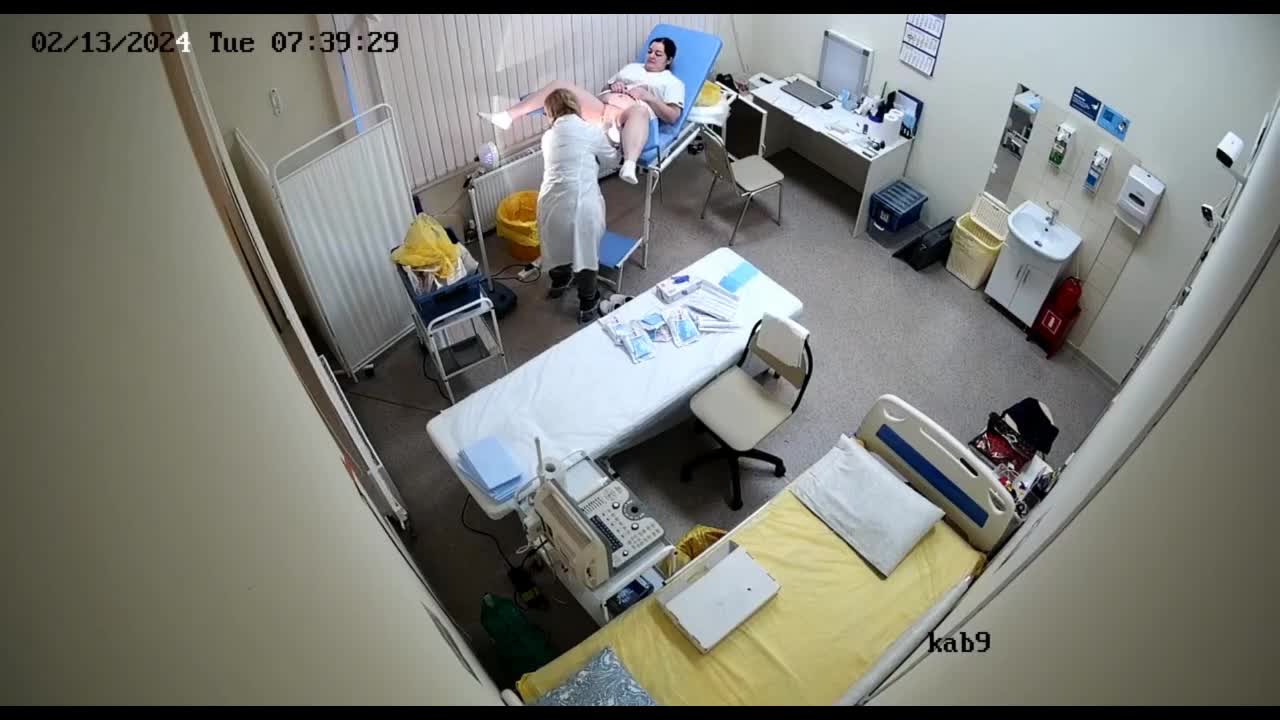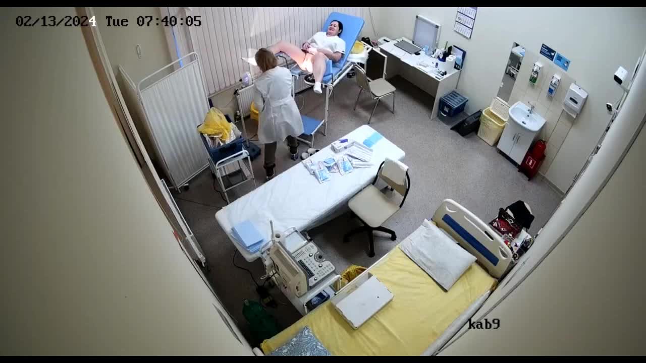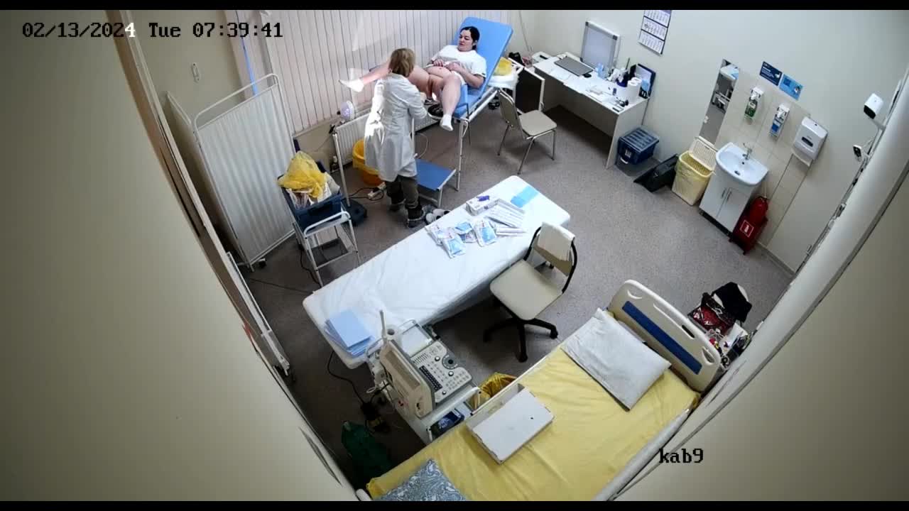 Доктор всесторонне обследует тело своей коллеги работающей в этой же больнице.Гинекологический осмотр и УЗИ.