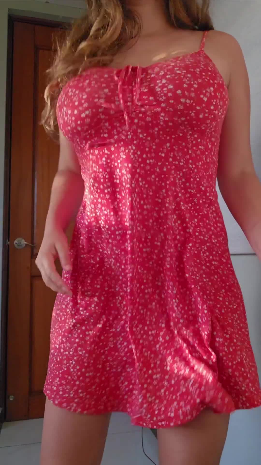 Тёлочка с ярком сарафане показывает идеальные упругие сиськи.