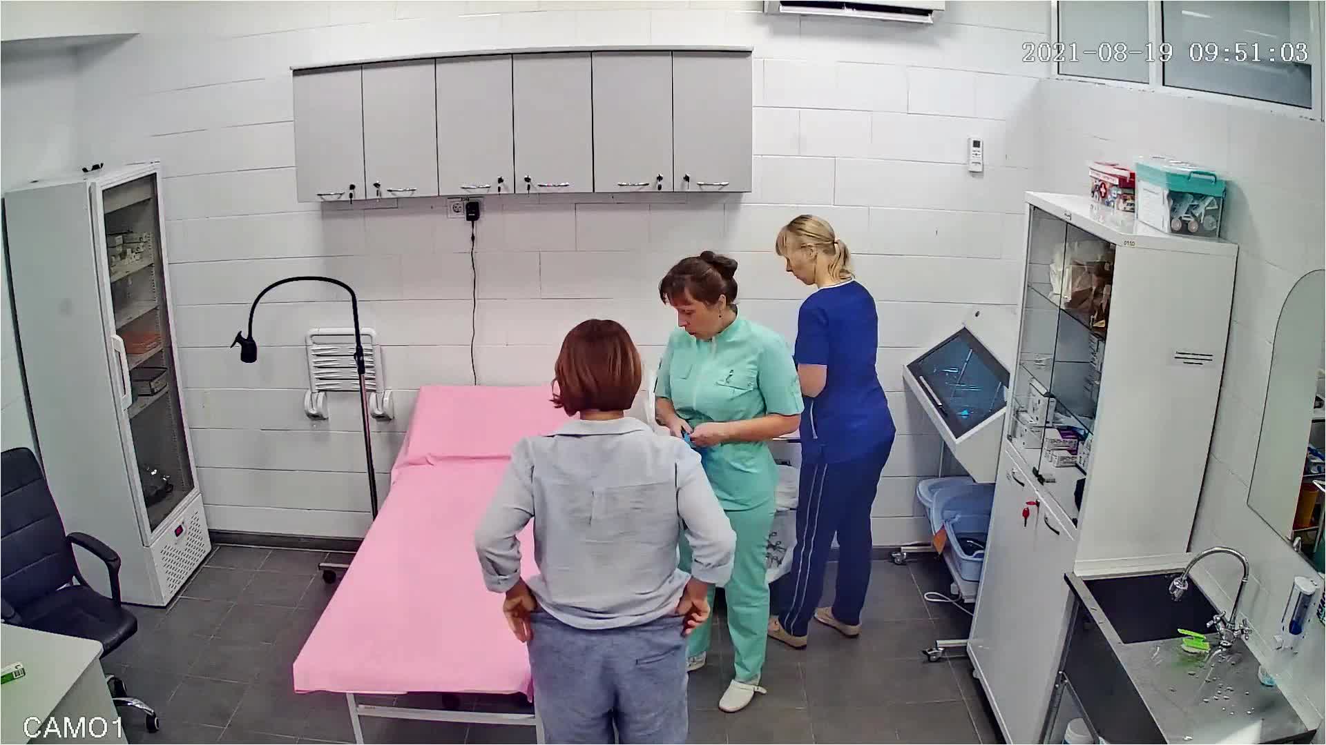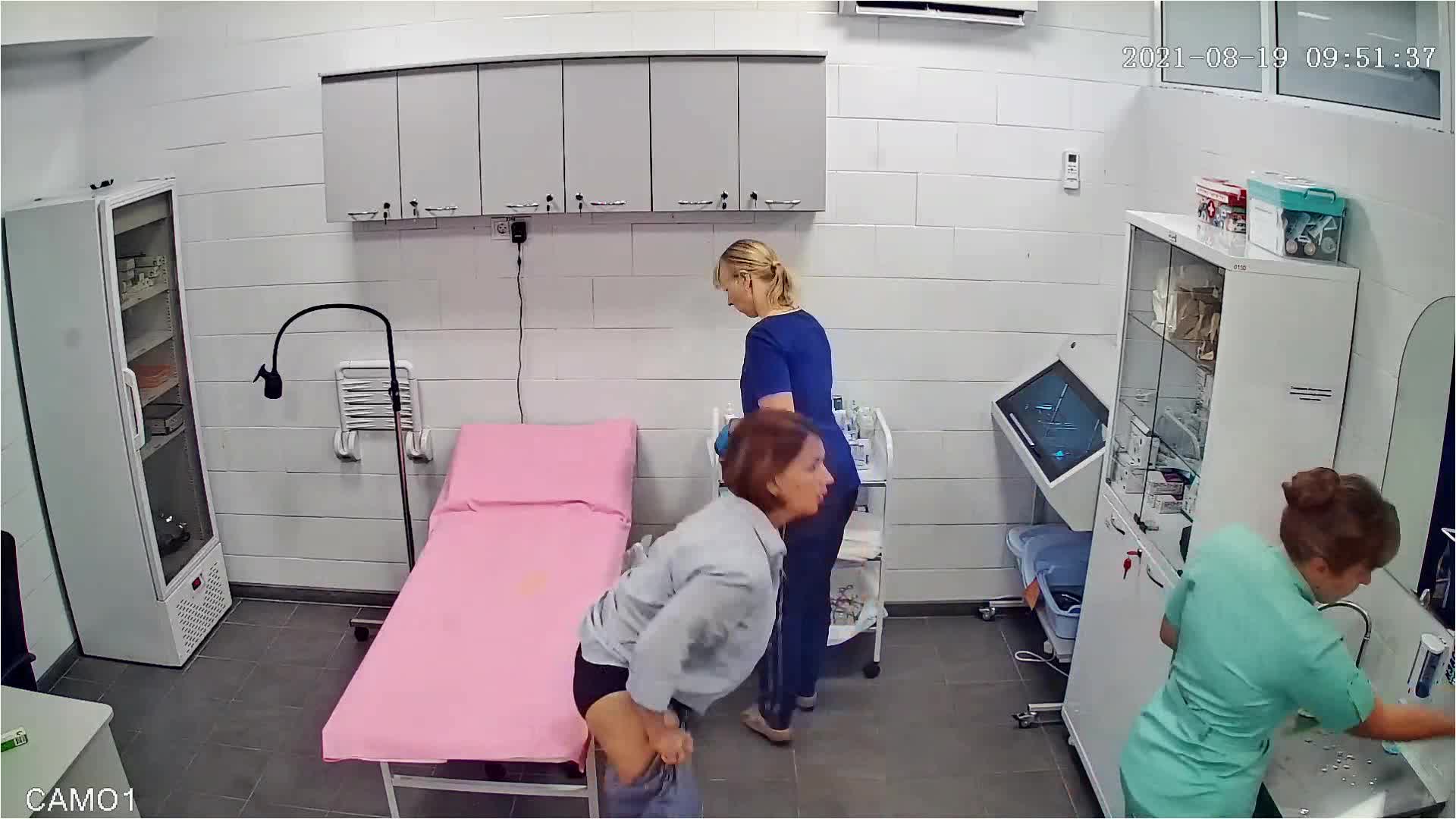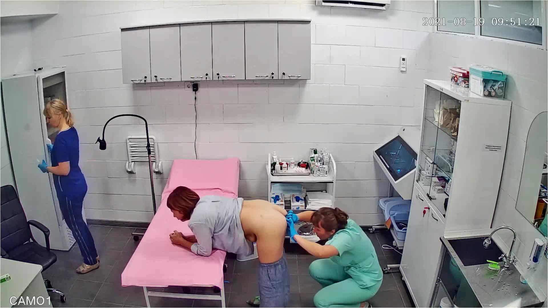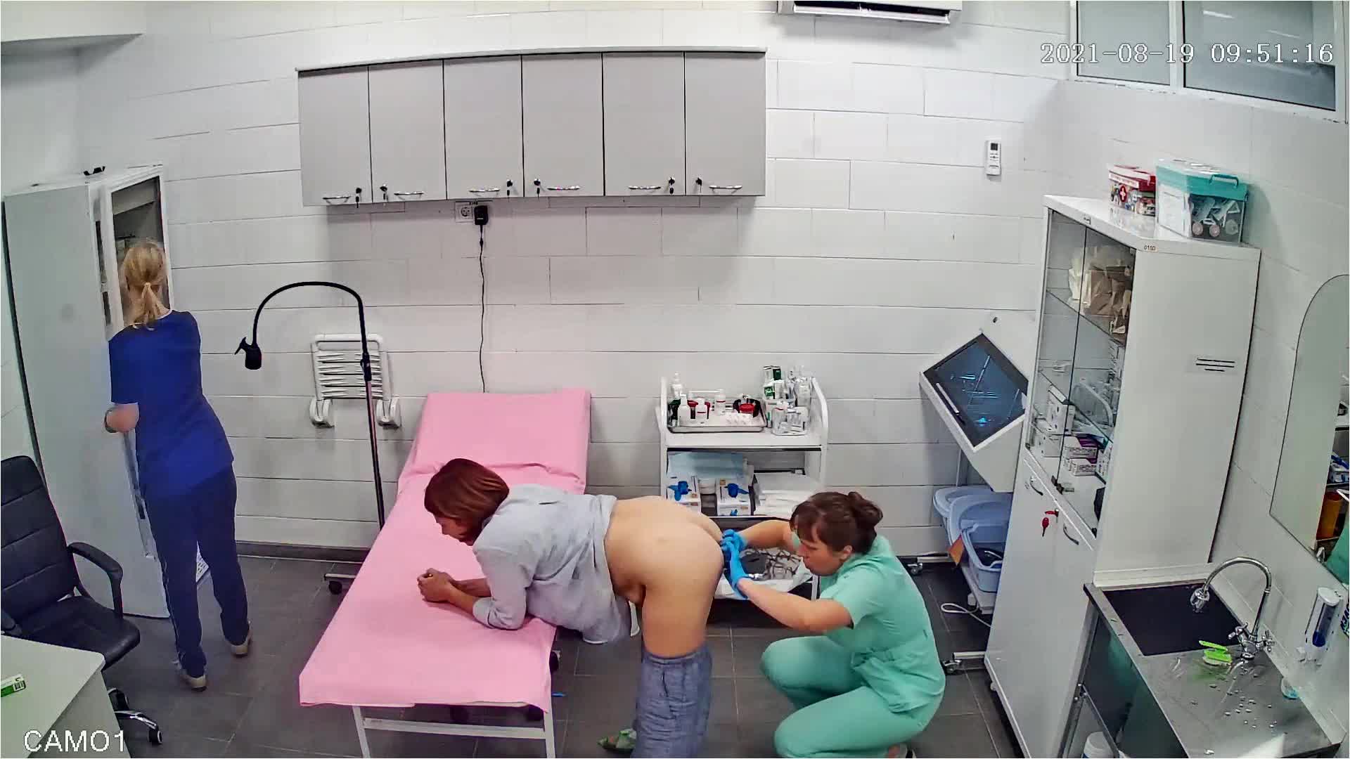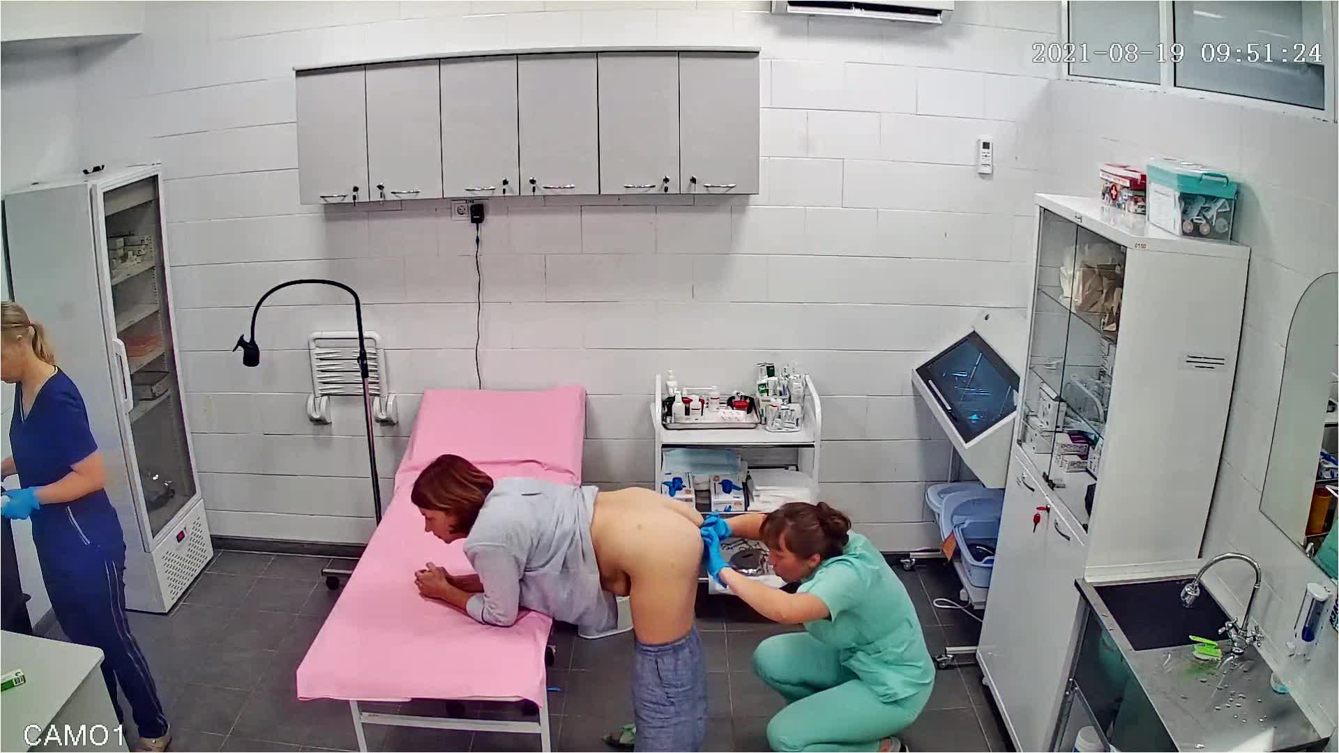 Врач раздвигает ягодицы и осматривает анус зрелой пациентки.Процедуру снимает скрытая камера.