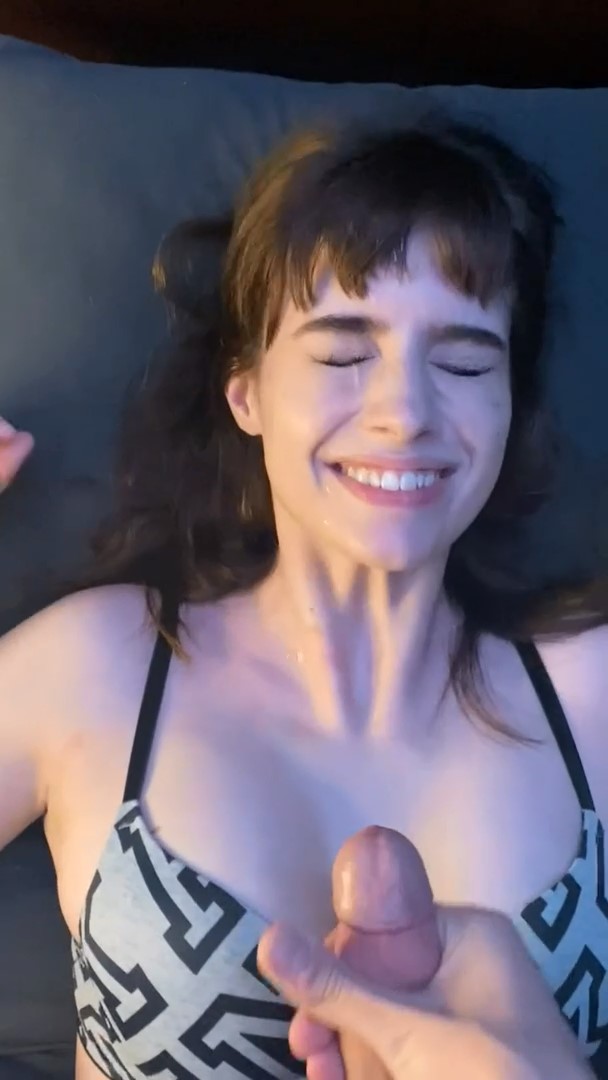девушка дрочит с улыбкой и получает на лицо сперму