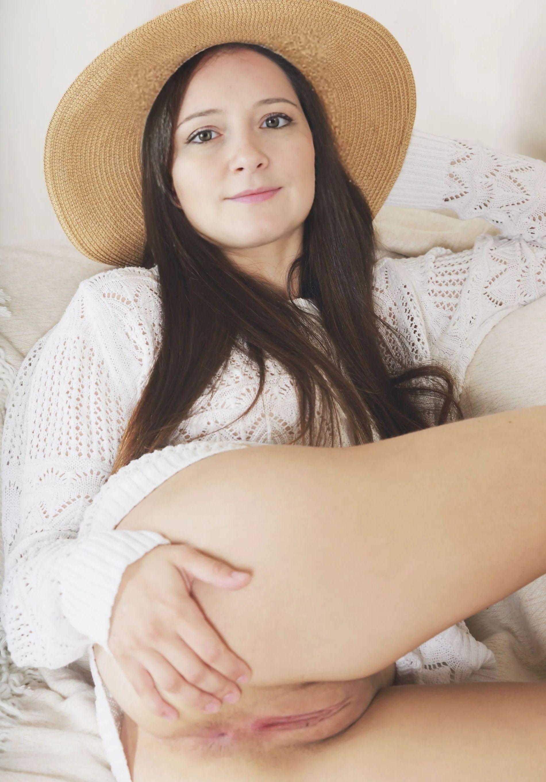 Милая стесняшка показывает свою аккуратную гладко бритую сочную щелку, готовую к приключениям