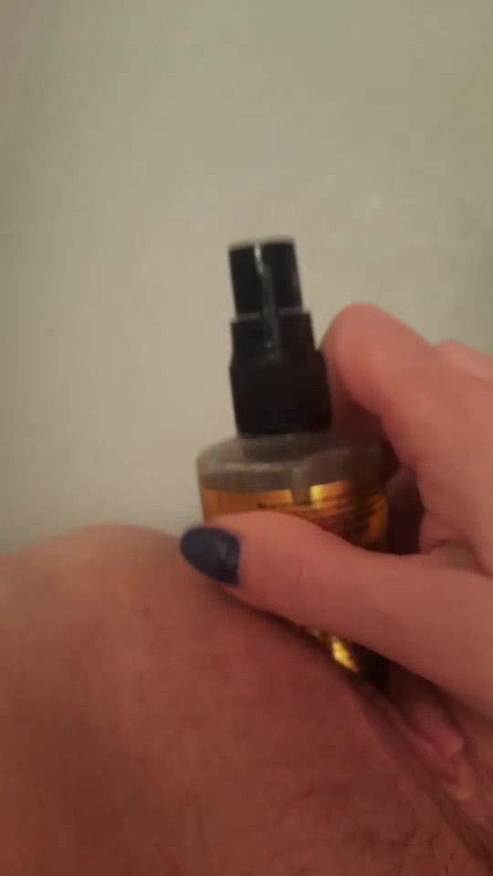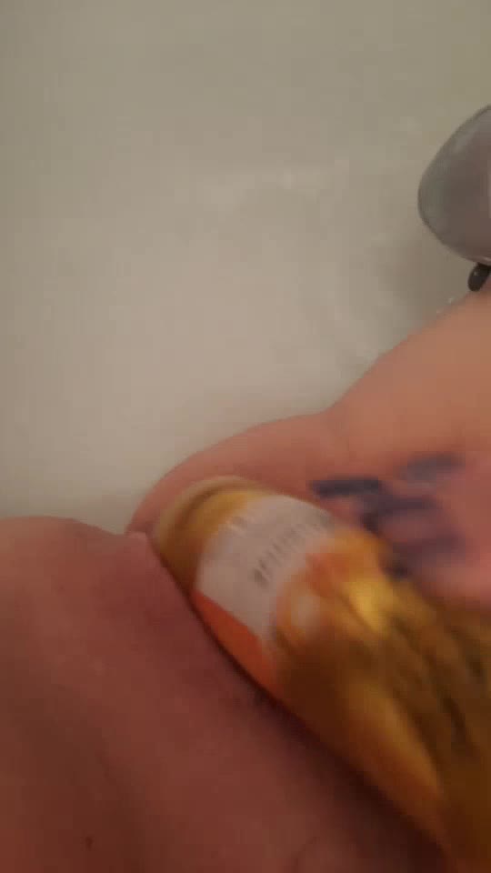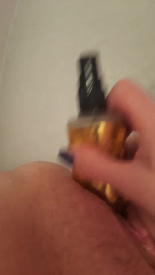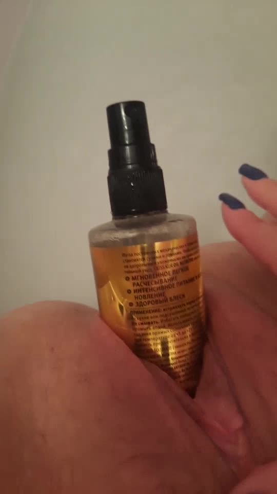 девушка трахает свою пизду большим флаконом вставляя его до конца