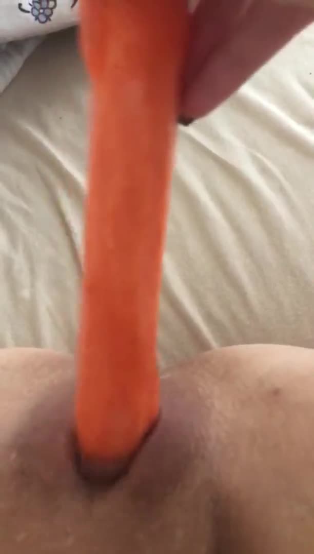Девушка показывает свои прелести, раздвигает ноги теребит влажную дырку, затем лежа расставляет ноги, берет морковку и начинает себя трахать, писька хлюпает, баба стонет