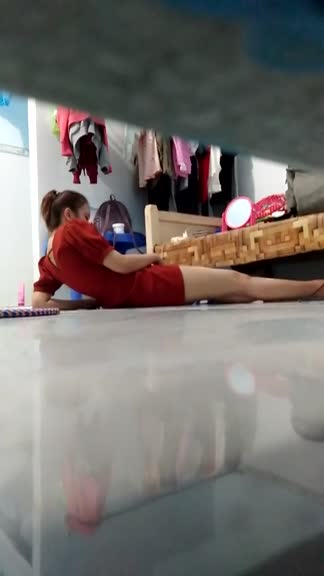 Брат из под двери скрытно снимает как его сестра мастурбирует в комнате,постоянно озираясь на дверь.