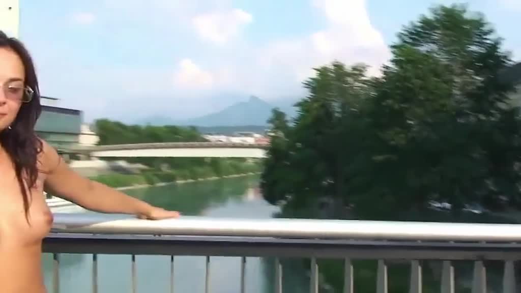 Девушка и так была в одной только майке на голое тело. А потом и ее сняла и осталась в одних туфельках посередине людных улиц.