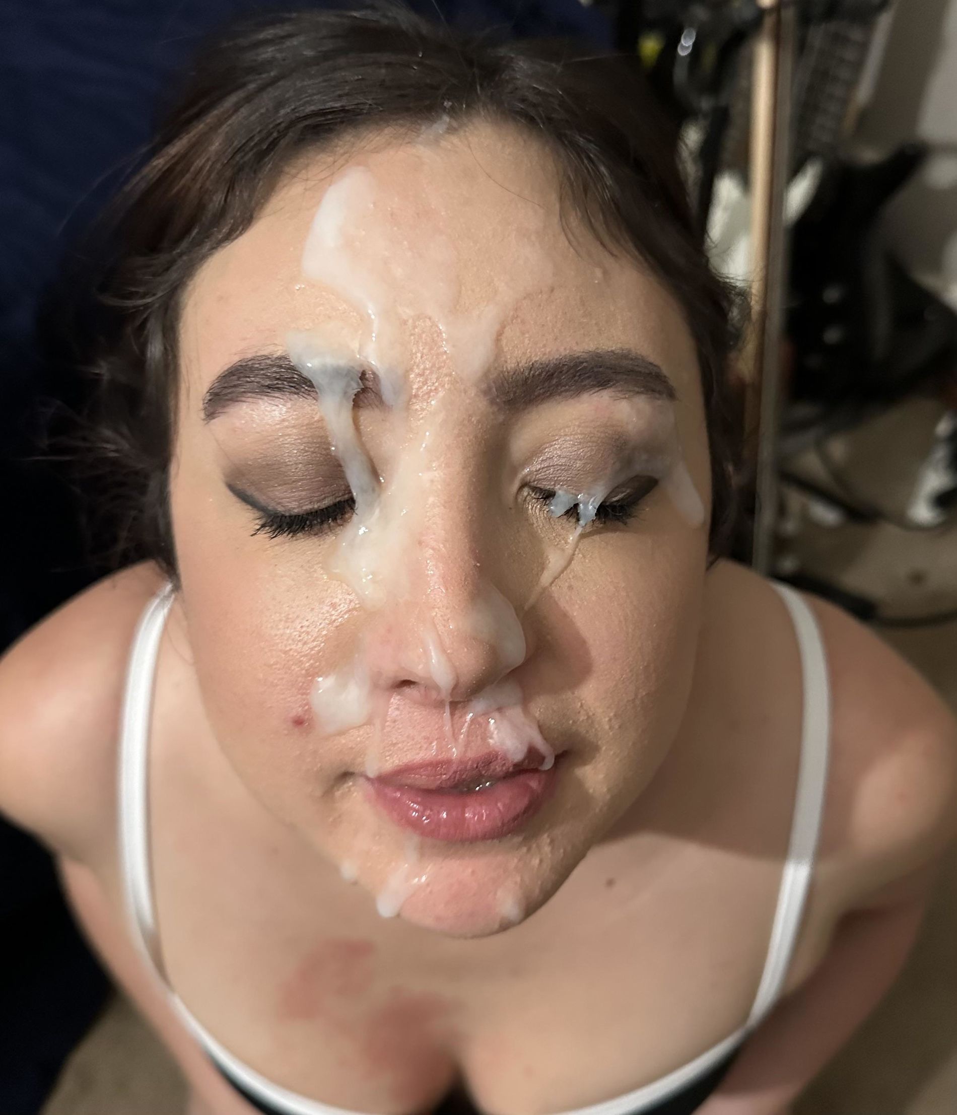 Показывает как выглядит её лицо после минета и окончания спермой на неё спермой.