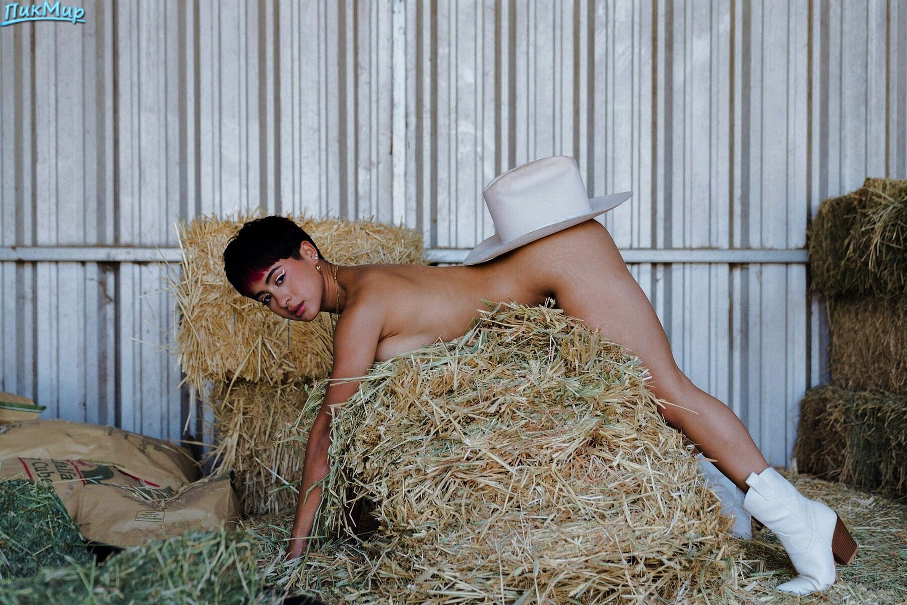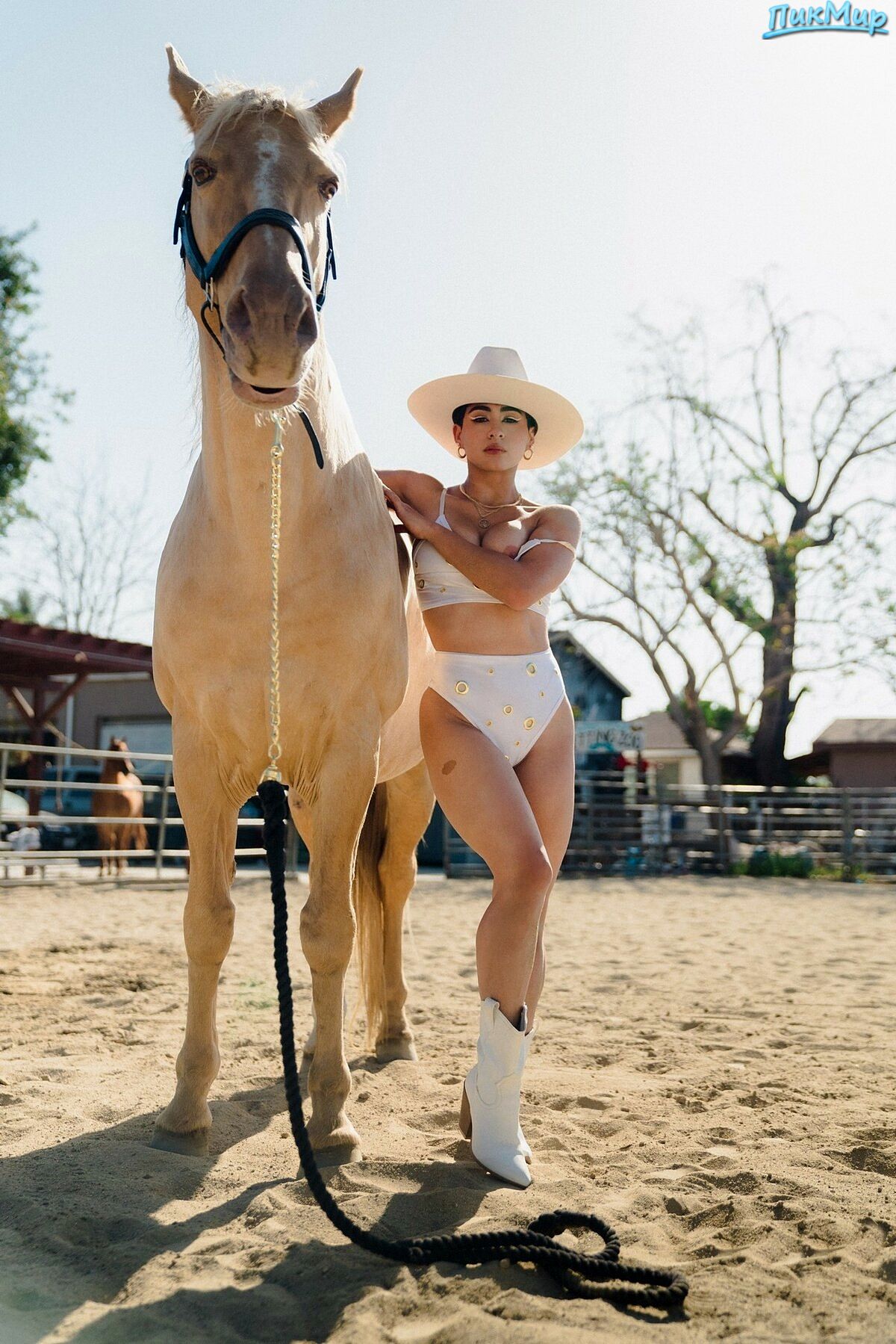 Молодая девушка со спортивным телом, красивой грудью и волосатой киской раздевается догола на ковбойском ранчо с лошадьми.