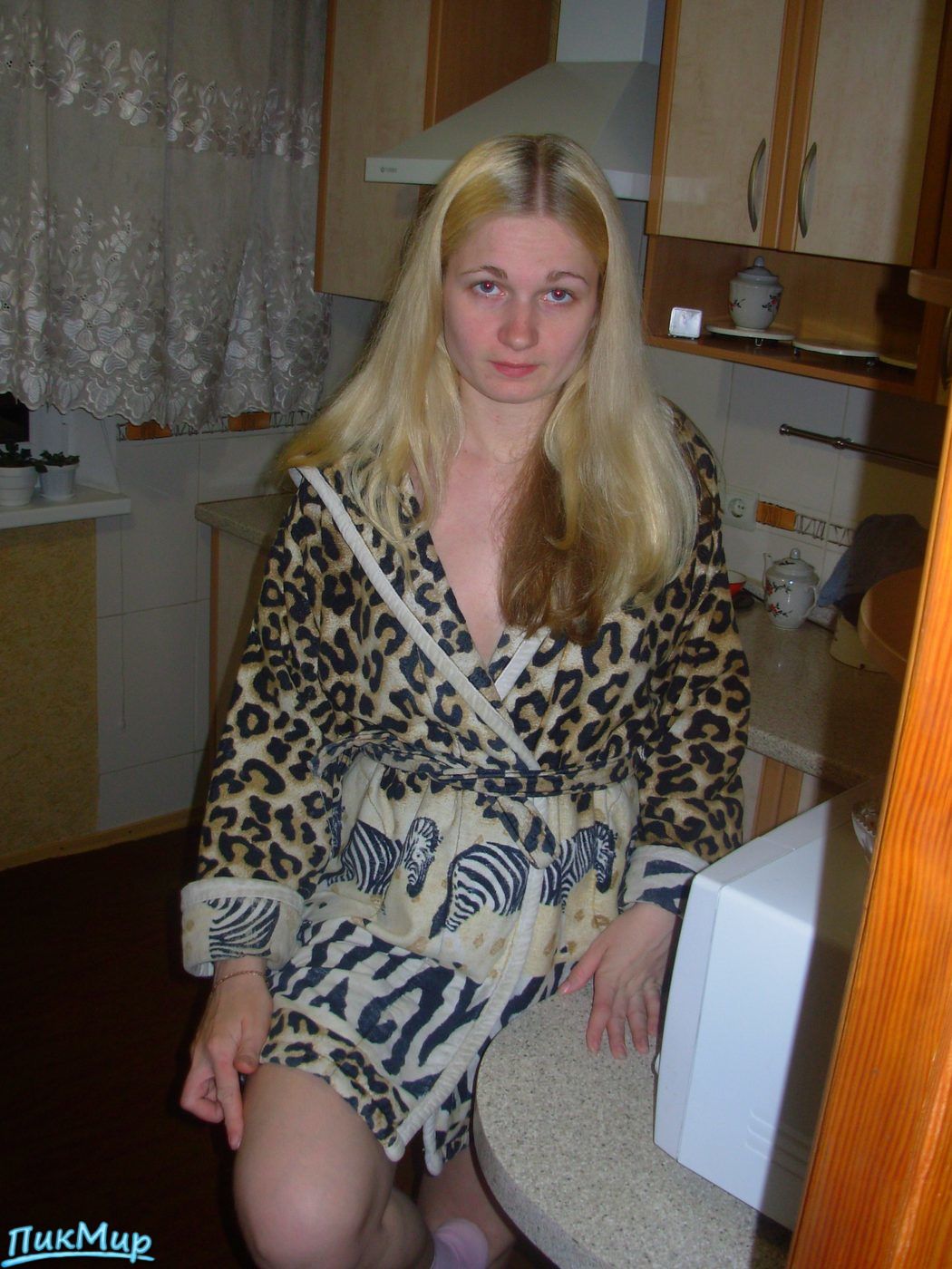 Со сброшенным халатиком. Она моложе выглядит. И грудка такая приятная налетая.