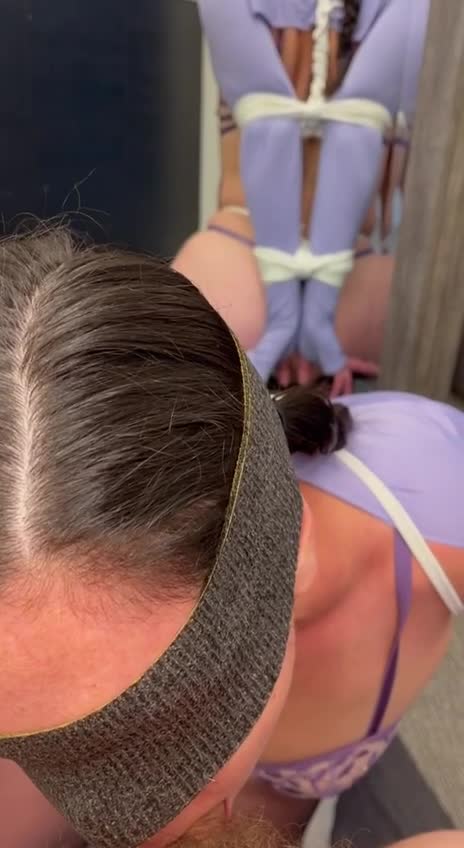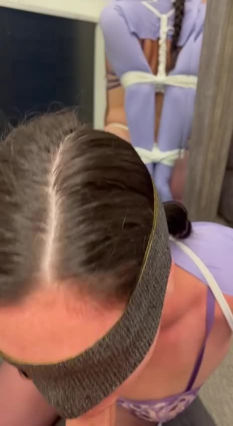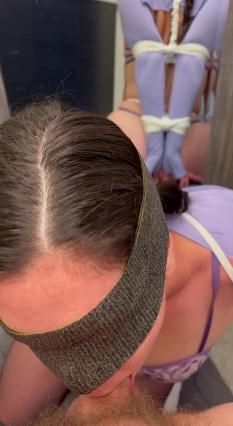 Рабыня со стянутымми сзади руками и ногами и с повязкой на глазах делает минет.
