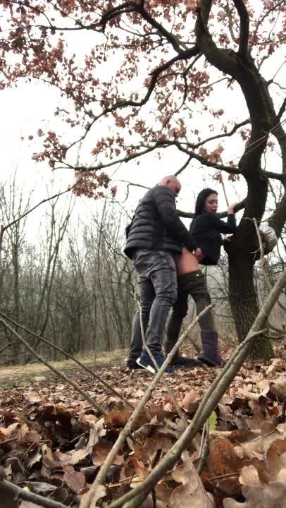 Стройная зрелая брюнетка делает минет на корточках в осеннем лесу и даёт трахнуть себя раком!