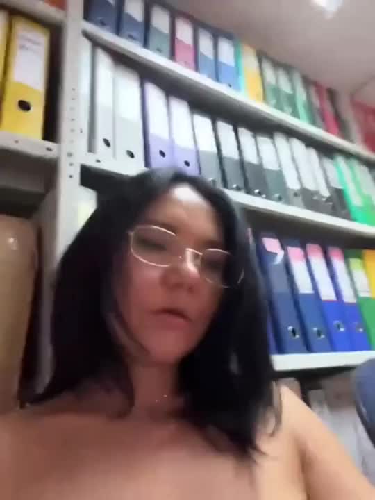 Заскучала на работе красотка. Устроила разминку с резиновым пенисом