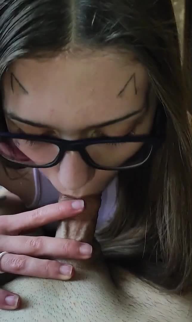 очкастая подружка умело отсасывает со слюнками и получает в рот сперму