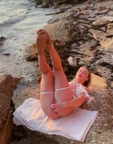 Шлюшка ранним утром развлекается со своим розовым "дружком" на берегу моря.