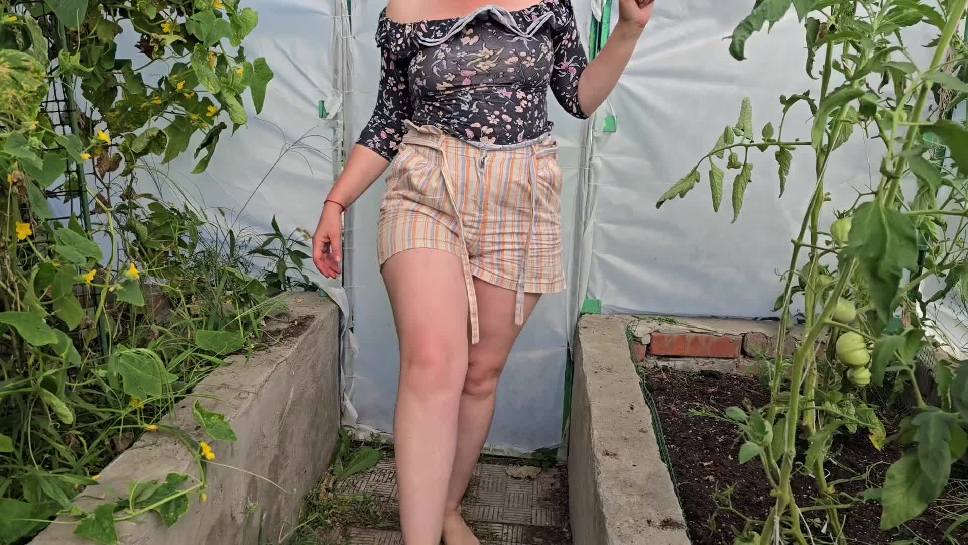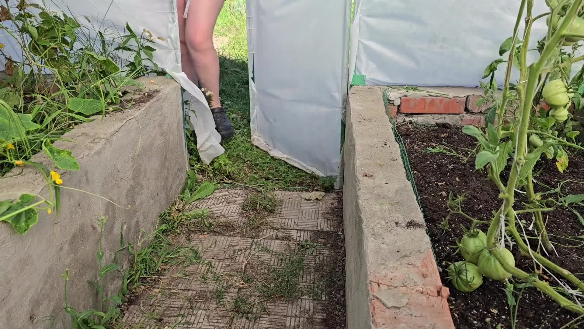Зрелая женщина заходит в теплицу,раздевается и голенькая танцует!