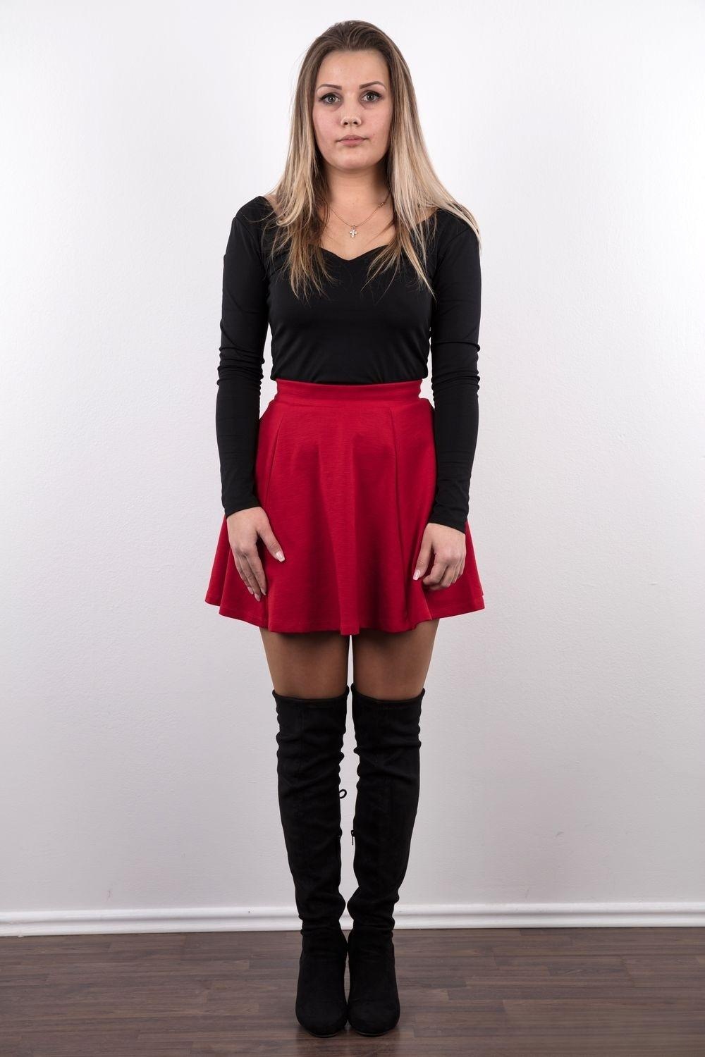 Симпатичная стройная девушка пришла на кастинг, чтобы продемонстрировать свои женские достоинства. Великолепное сочетание красного и черного здорово подготовило устроителей кастинга к тому моменту, когда девушка лишила себя сначала юбки и блузы, а потом и элегантного черного белья. Милую гладкую киску девушки фотограф просто не мог не сфотографировать крупным планом. Приятного просмотра всем.