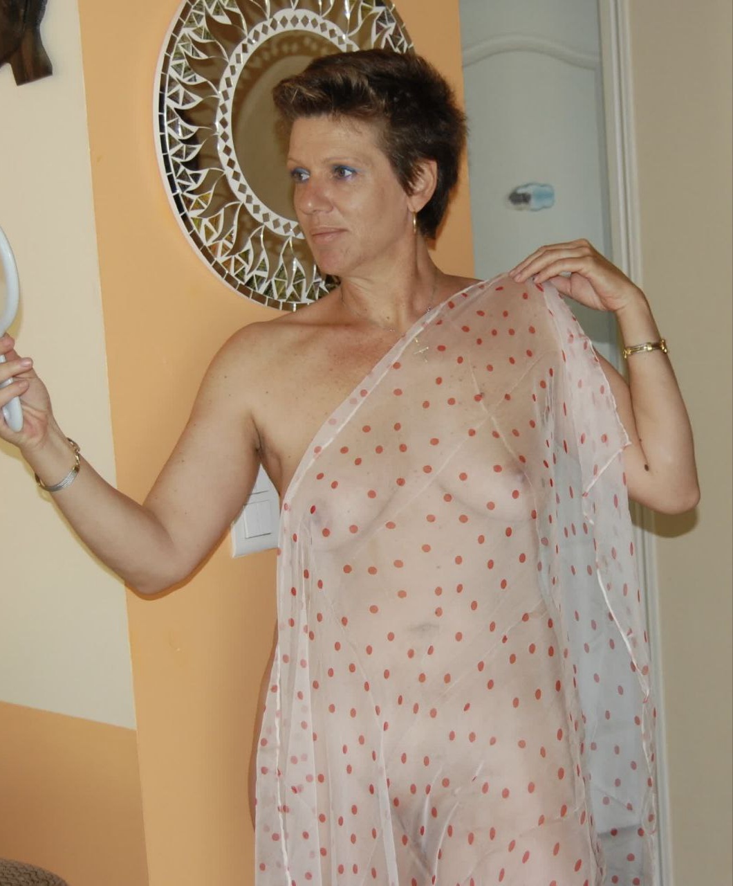 Зрелая стройная коротко стриженная женщина не стесняясь демонстрирует свое тело!