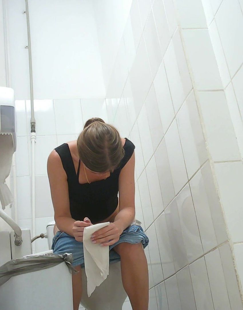 Спортивная и очень фигуристая женщина попалась на скрытую камеру в туалете. Обратите внимание на странные манипуляции с трусиками и шортами. Всем - приятного просмотра.
