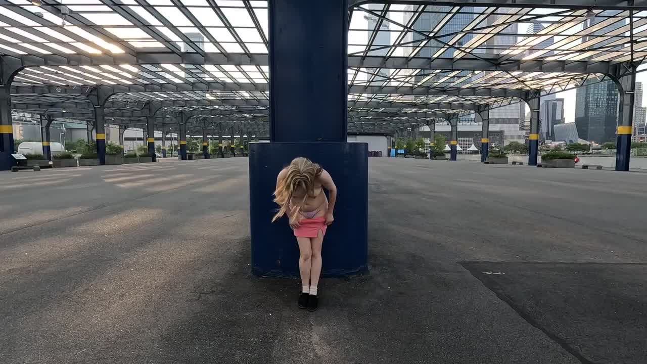 Женщина раздевается на общественной крытой парковке в центре города. Или, может быть, это пустой выставочный центр?