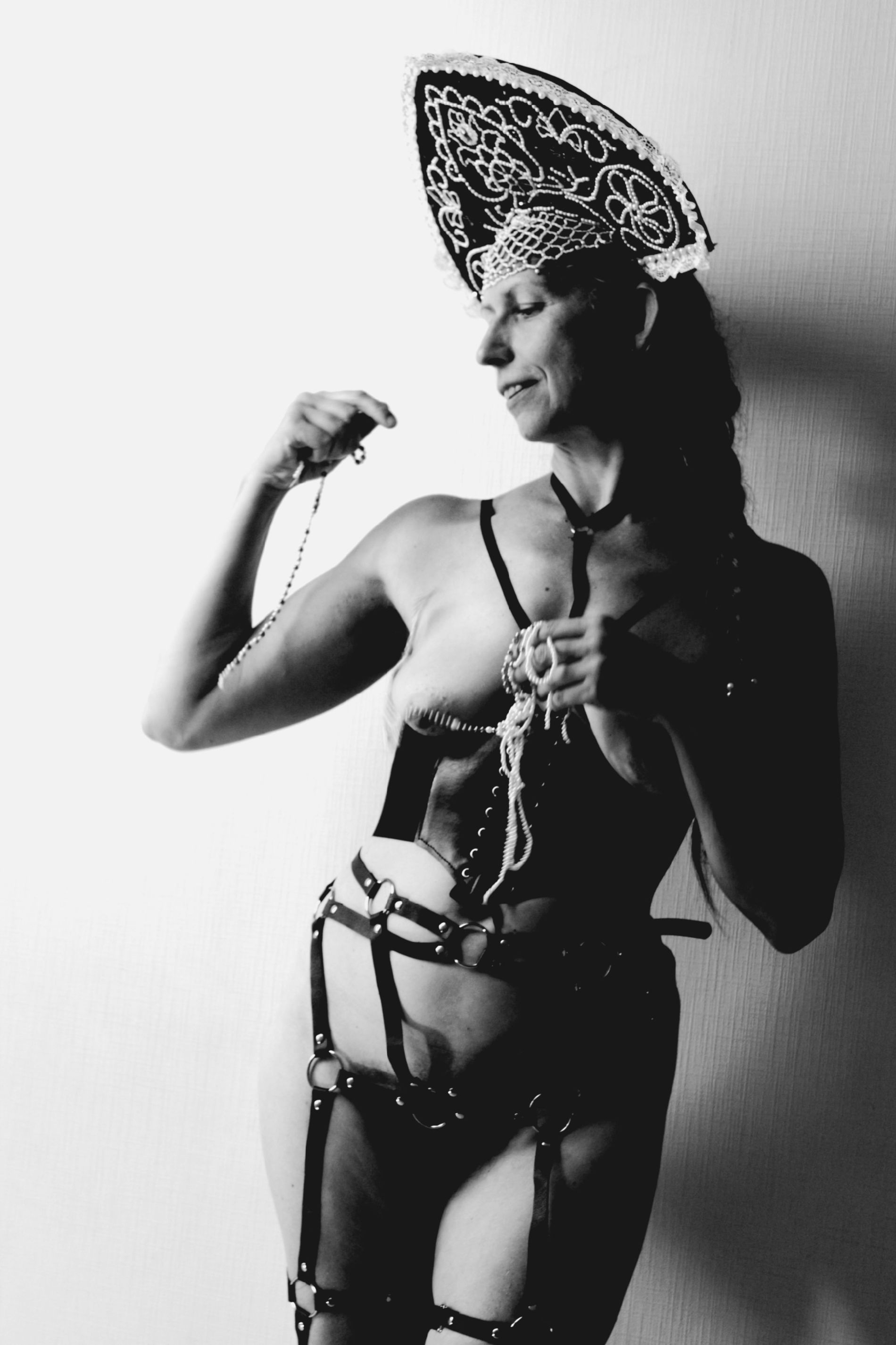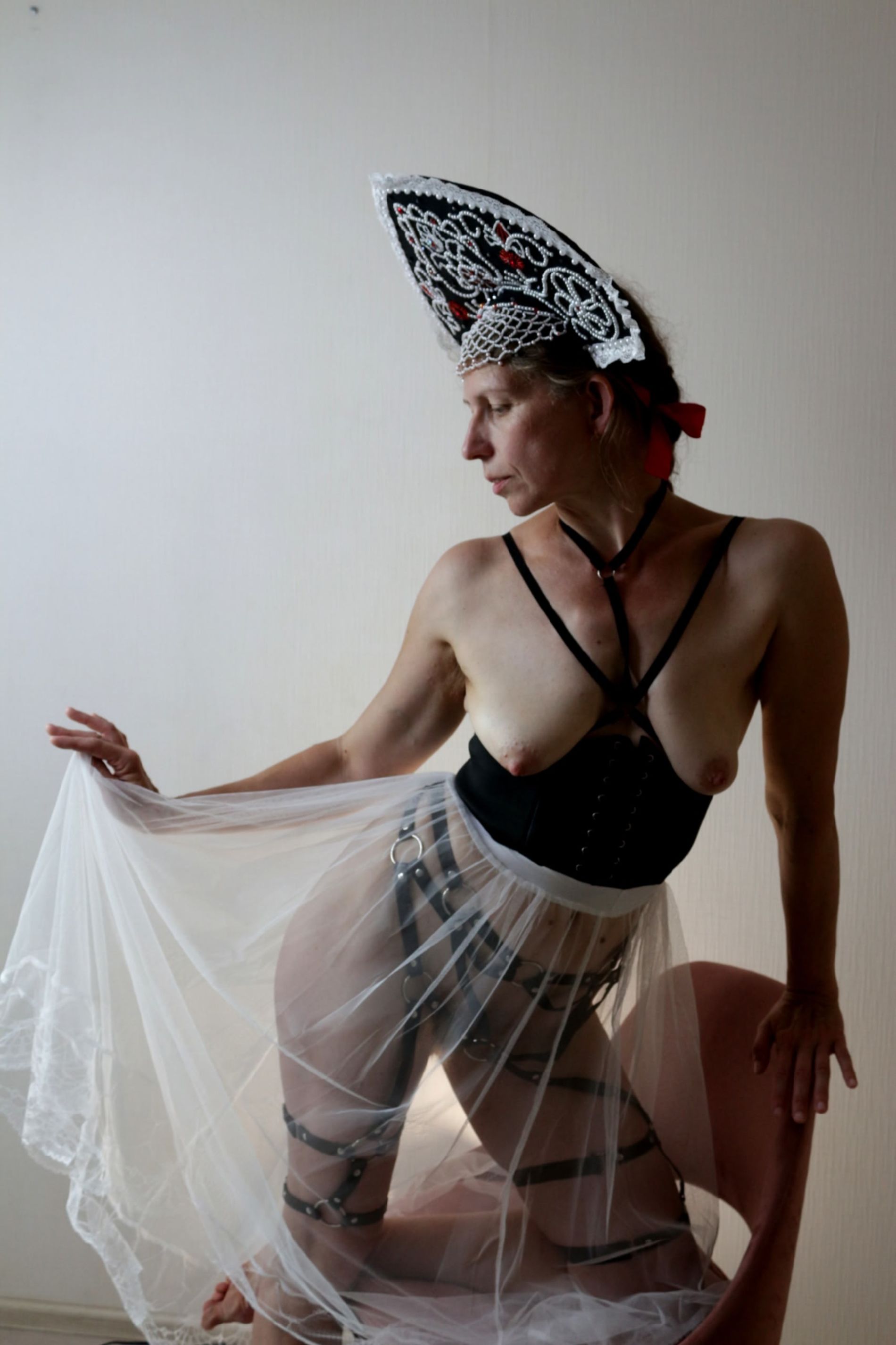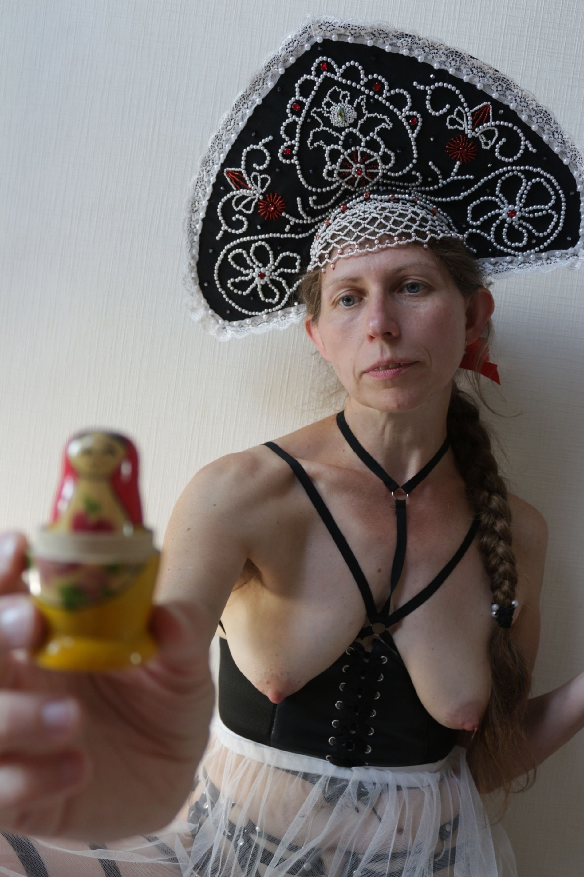 Нашел знакомой женщины фотографии в вк. Мне кажатся они очень интересные. Сочетание кокошника и бдсм очень интересное сочетание