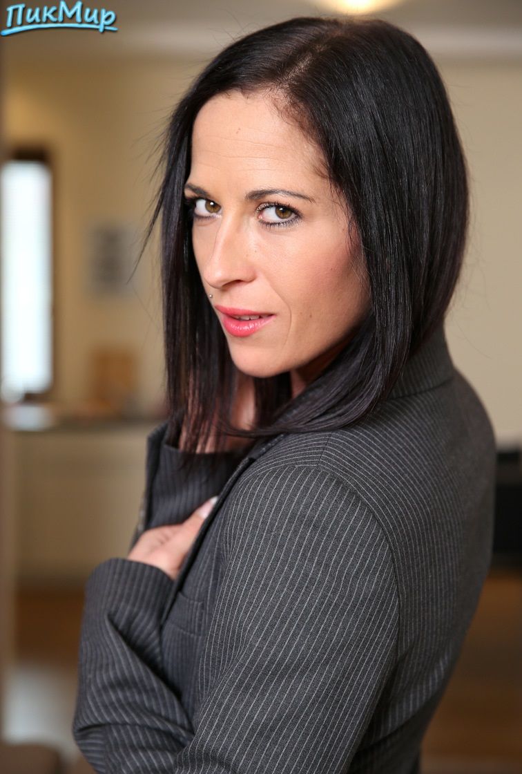 Строгая брюнетка снимает пиджак.
