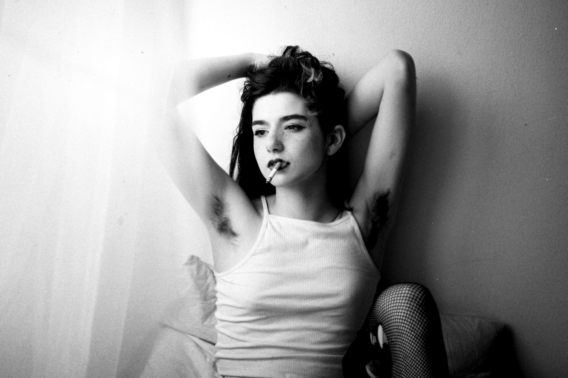 Со своей сигаретой, волосатыми подмышками и черно-белой фотографией Камилла выглядит как воплощение набоковской Лолиты или архетипической женщины-вамп.