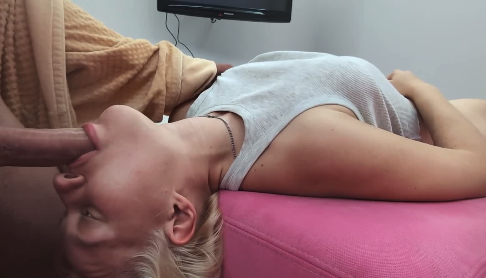 Член заходит прямо ей в горло