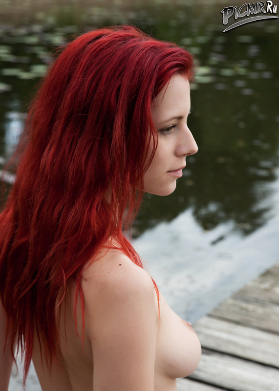Красиво у пруда на мосточках позирует сия красноволосая стройная девчушка!